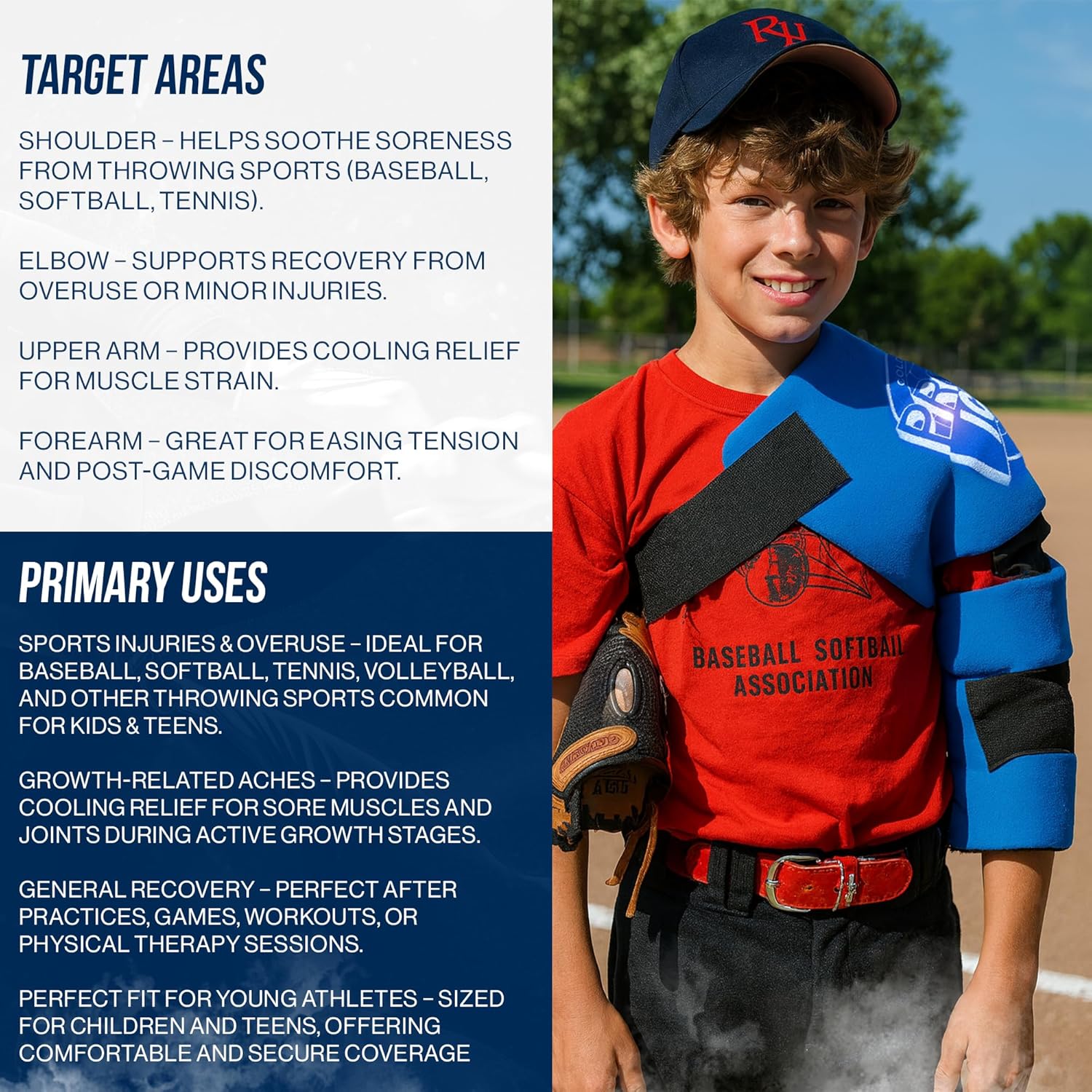- THERAPEUTIC COLD THERAPY - Enjoy the benefits of cooling therapy directed at the affected shoulder and elbow areas to ease the pain of your kids. This targeted approach ensures that injuries like shoulder tendinitis, throwing injuries, and chronic instability receive the relief they deserve, promoting faster recovery and reduced swelling.