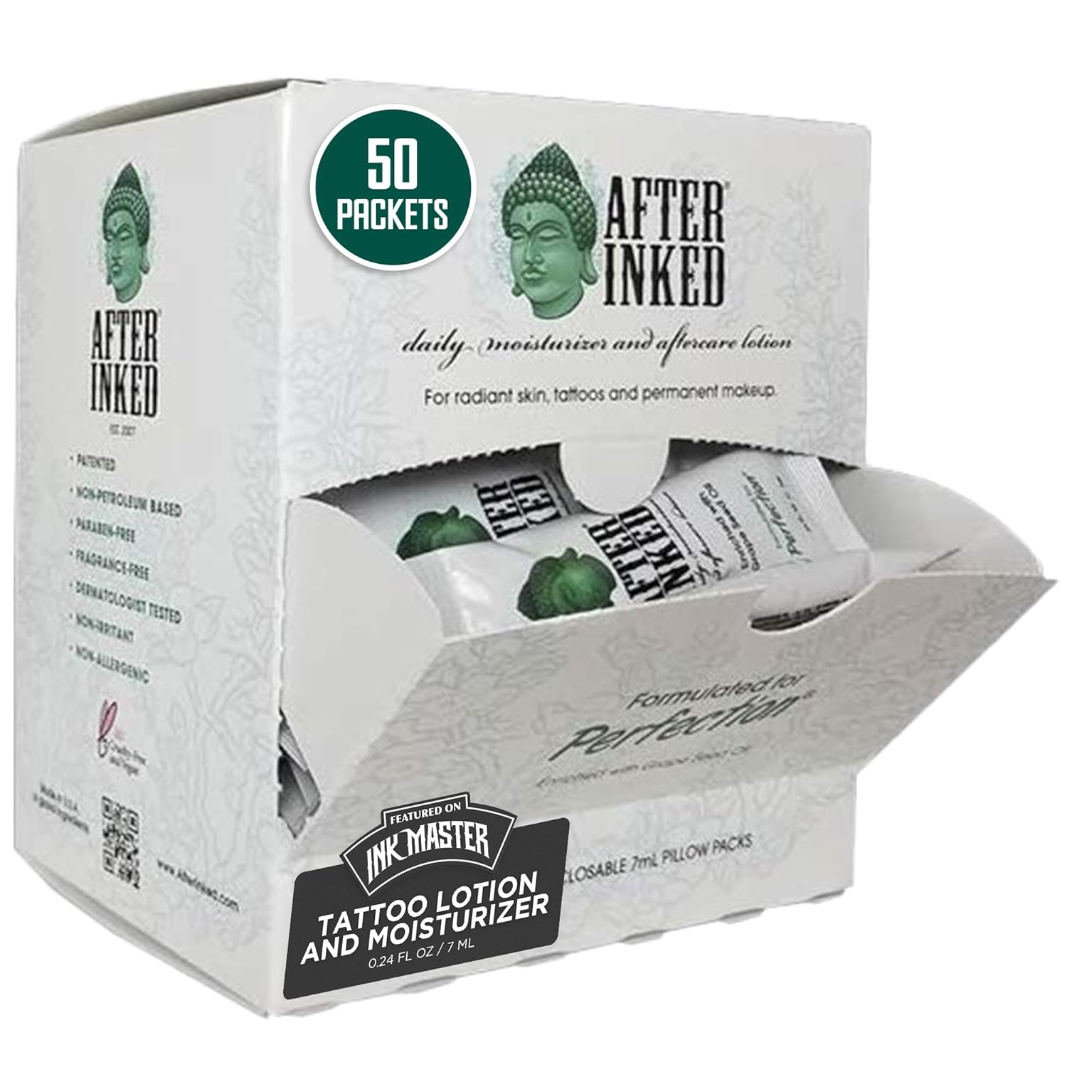 After Inked Tattoo Aftercare Lotion – Tattoo Moisturizing Balm, As Seen on INK MASTER – Hydrating Cream with Grape Seed Oil, Skin Nourishment & Daily Maintenance, Reclosable Pillow Pack (50-Pack), 7ml