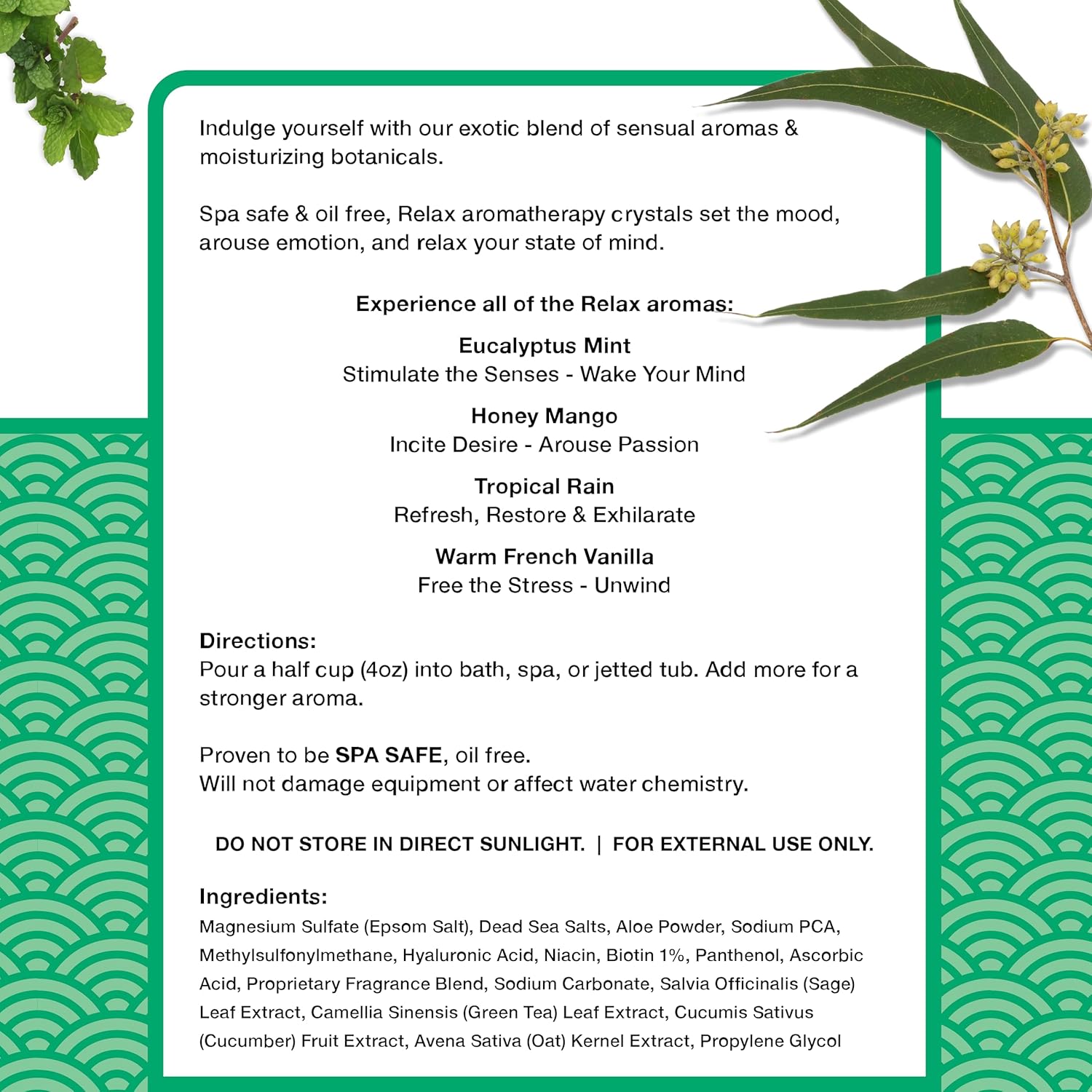 - CRISP EUCALYPTUS MINT SCENT: Cool and invigorating, this fresh eucalyptus mint blend brings a spa-like clarity to every soak. Designed for use in hot tubs and Jacuzzis, these aromatherapy bath salts elevate the mood without overpowering the space.