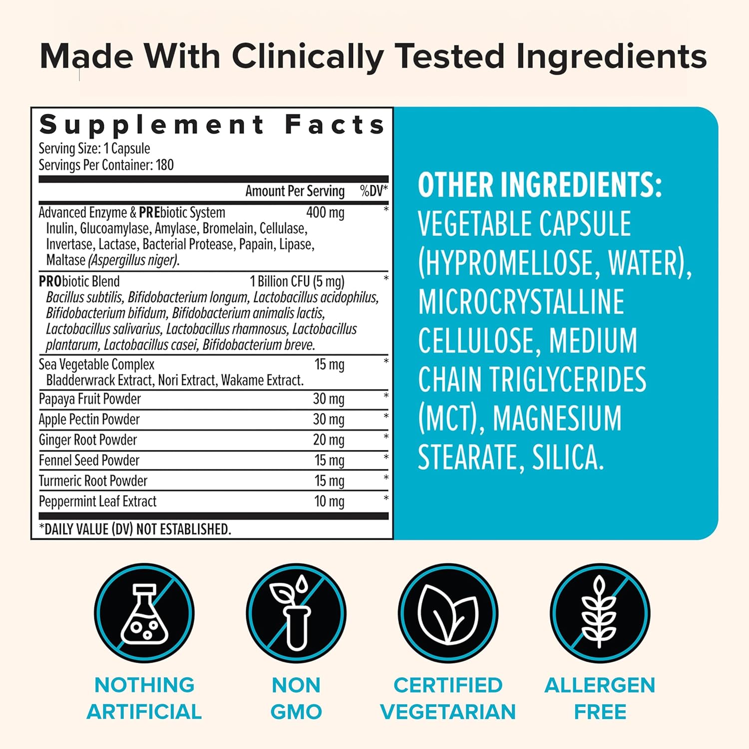 - 3-in-1 Formula β Blend of lab proven enzymes, clinically proven probiotics and prebiotics works synergistically to break down proteins, fats, and carbs while resorting digestive flora balance for optimal nutrient absorption and digestion maintain digestive wellness and promote regularity