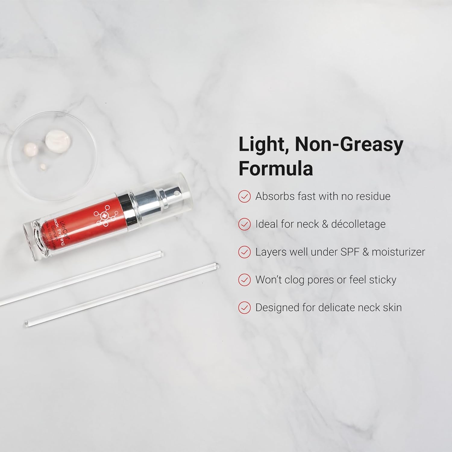 - Lightweight, Fast-Absorbing Formula - Designed specifically for the delicate skin on the neck and décolletage. This non-greasy serum absorbs quickly and layers well under moisturizers or SPF.