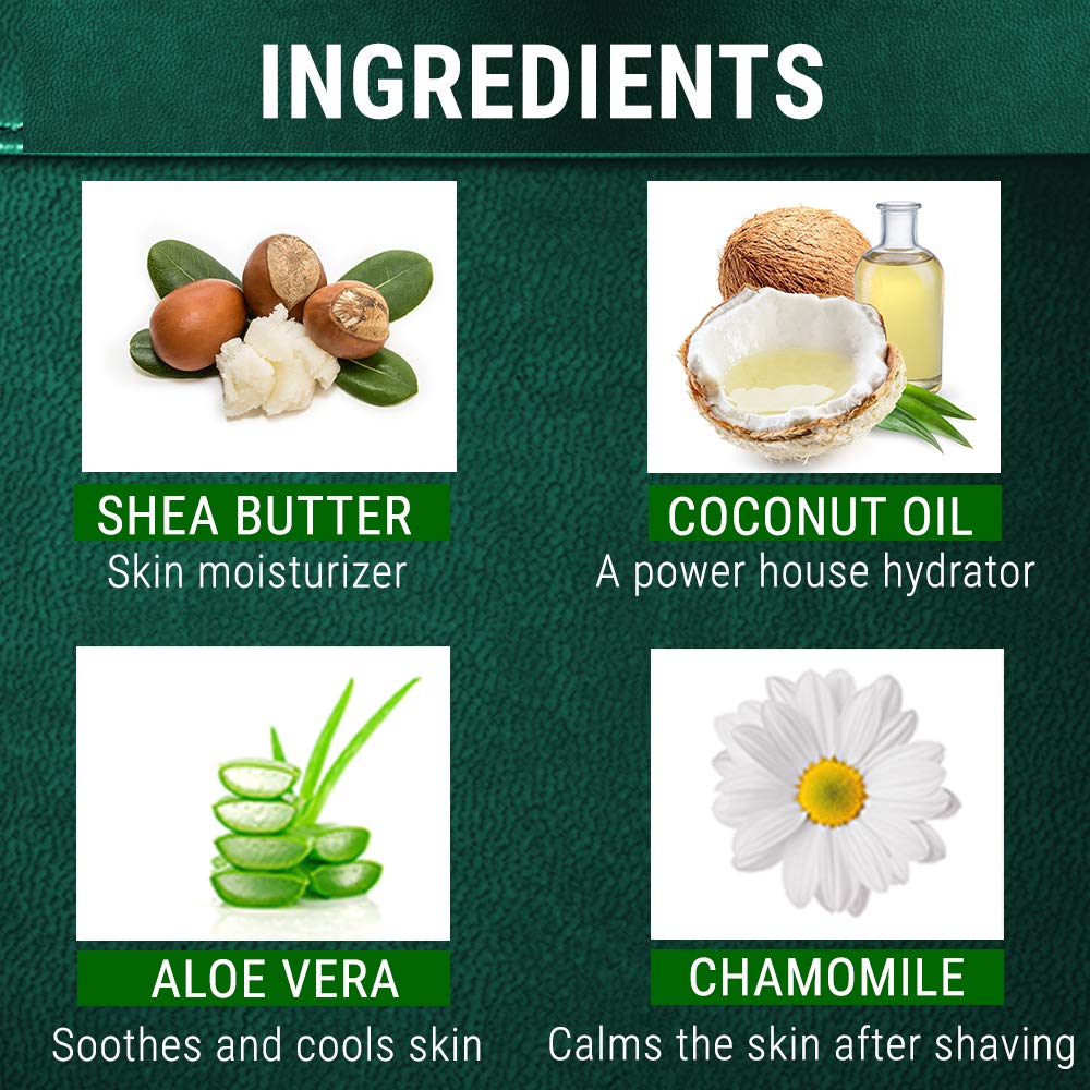 - MADE OF NATURAL INGREDIENTS: It combines the benefits of Shea butter, Coconut oil, Aloe Vera and Chamomile to deliver the classic gentleman’s shave by moisturizing, hydrating, soothing, and calming the skin after shaving. Suitable for all skin and beard types. Specifically formulated to suit your shaving needs. It is also, paraben and cruelty - free. Never tested on animals - proudly made in the US.