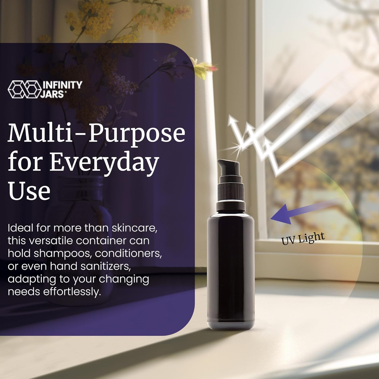 Infinity Jars 50 Ml (1.7 fl oz) Refillable Ultraviolet Black Glass Pump Bottles Leak-Proof Travel Containers for Toner, Sanitizer, Beard Oil, Hair Serum, Essential Oils 3-Pack