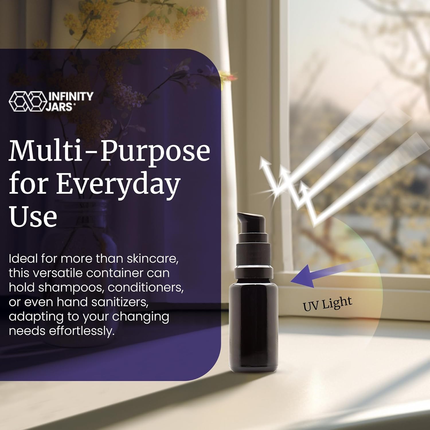 Infinity Jars 15 Ml (0.5 fl oz) Refillable Ultraviolet Black Glass Pump Bottles Leak-Proof Travel Containers for Toner, Sanitizer, Beard Oil, Hair Serum, Essential Oils 10-Pack
