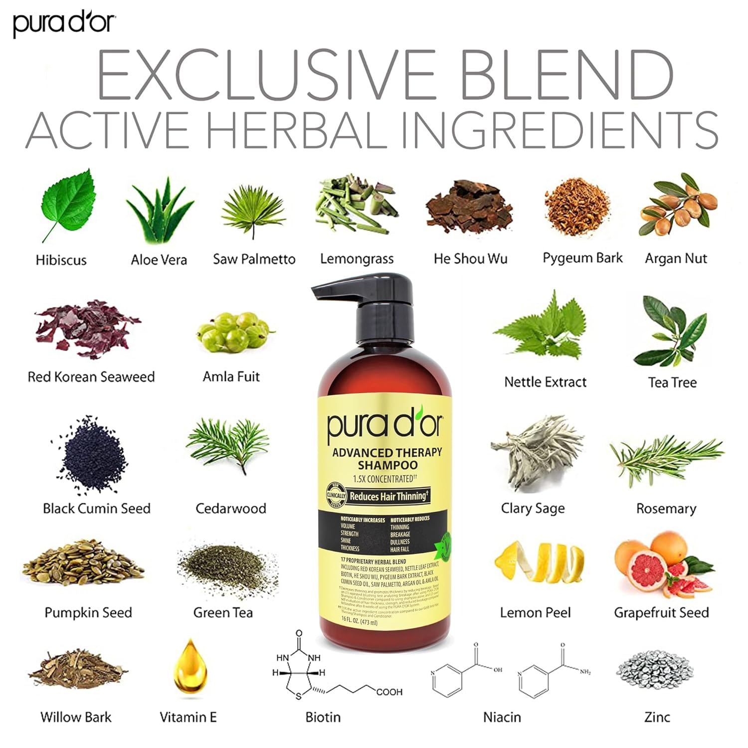 - INCREASED VOLUME, REDUCED THINNING: Our hair thickening shampoo and conditioner set is formulated with biotin and our exclusive proprietary blend of 17 key ingredients, 1.5x concentrated, including nettle extract, pumpkin seed, and black cumin seed oil. Clinically tested to reduce the appearance of hair thinning, promote hair strength and thickness with increased volume and reducing breakage. Individual results may vary..