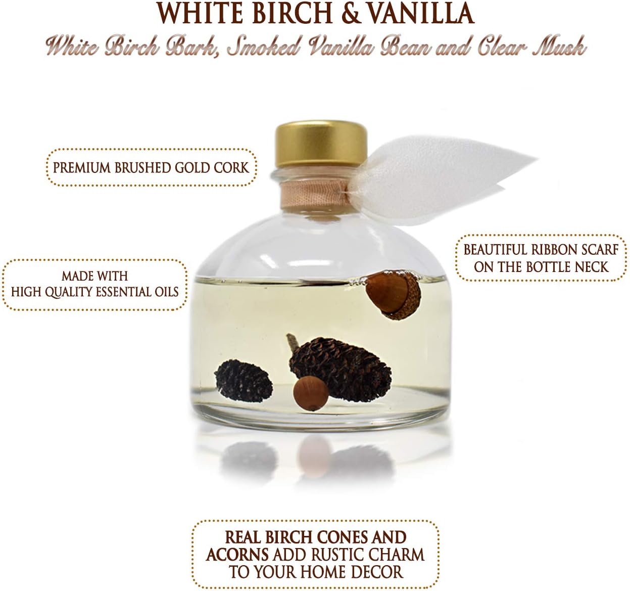 - WHITE BIRCH & VANILLA – is a cozy and woodsy blend of White Birch Bark, Smoked Vanilla Bean, and Clear Musk; the Bell Diffuser with a tan ribbon accent and rustic pinecone-and-acorn details creates a lodge-style appeal; ideal for beige, camel, and warm neutral interiors.