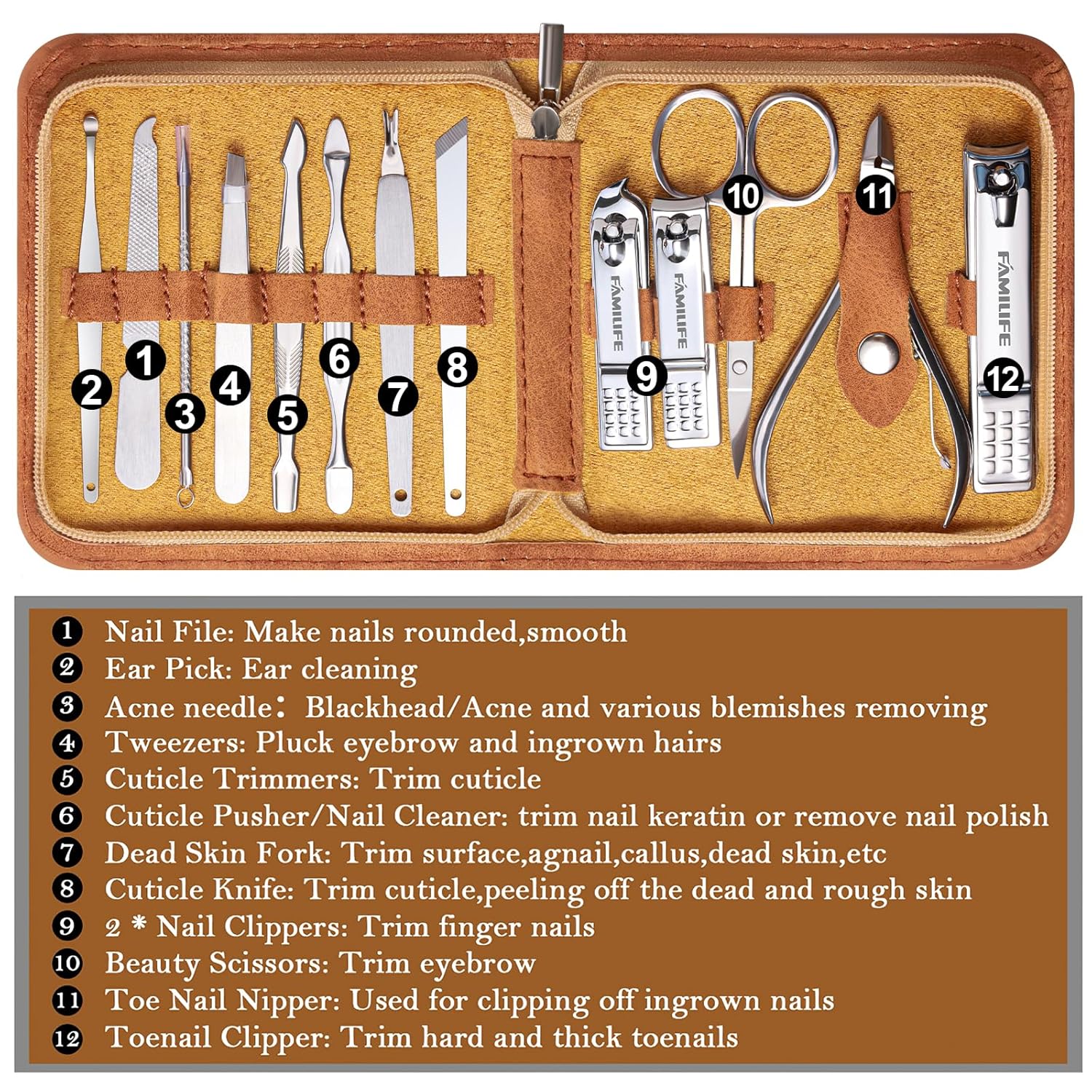 - Manicure Set & Nail Kits- FAMILIFE stainless steel manicure set men and women manicure set is made with High Quality Stainless Steel. This is a nail clippers for men or nail care kit for women. Dedicated mens grooming kit and ingrown toenail tool. Either male manicure set or mens nail care kit. This nail clipper kit and grooming kit for men is a nail clipping kit great gift for your family and friends, or as leather gifts for men or women
