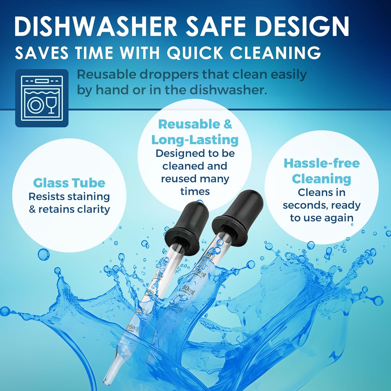 - EASY TO CLEAN & DISHWASHER SAFE: Our glass droppers are easy to clean and dishwasher safe. What that means to you is that you don't have to spend a ton of time taking them apart and losing all of those tiny pieces. What that means to you is less time cleaning and that ultimately means more time to enjoy other things!