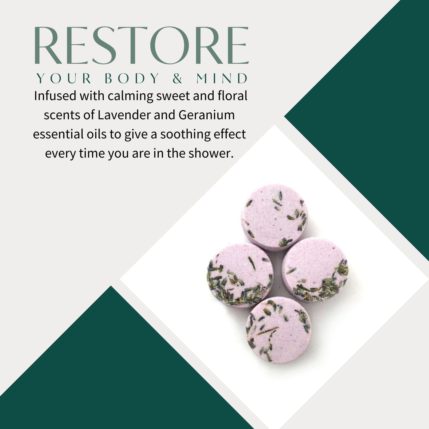 - RESTORE YOUR BODY & MIND: Our lavender shower steamer is infused with calming sweet and floral scents of Lavender and Geranium essential oils to give a soothing effect every time you are in the shower. Lavender helps to reduce stress and invigorates your senses. Its pleasant smell is a great way to enrich your environment that encourages you to relax, de-stress, and give yourself time to breathe!