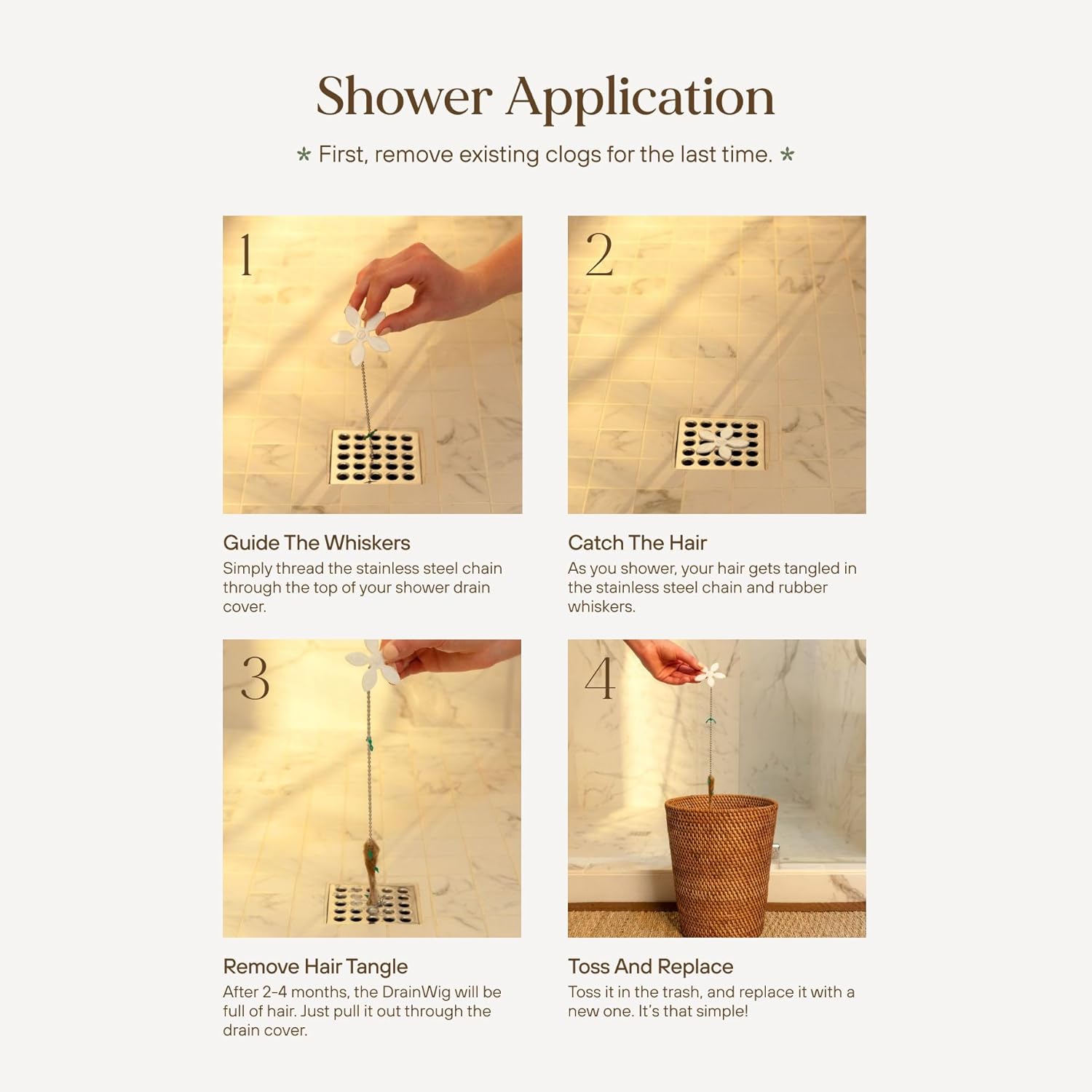 - PATENTED DESIGN: The DrainWig fits most standard shower drains and does not obstruct the flow of water.