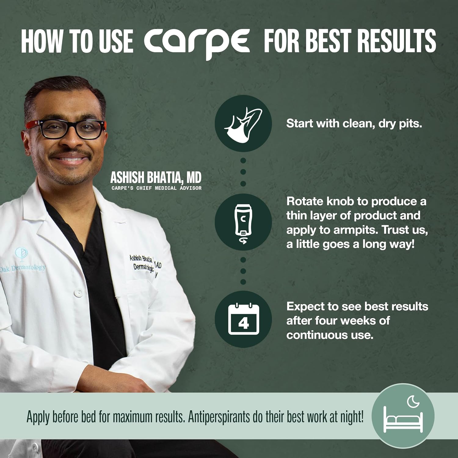 - EASY TO USE ANTIPERSPIRANT DEODORANT: With a thin layer of Carpe Antiperspirant Lotion you can reduce sweat with safe and effective ingredients. Apply our sweat control deodorant before bed for best results and say goodbye to your armpit sweat & smelly underarms without the downsides of prescription oral treatments or iontophoresis.