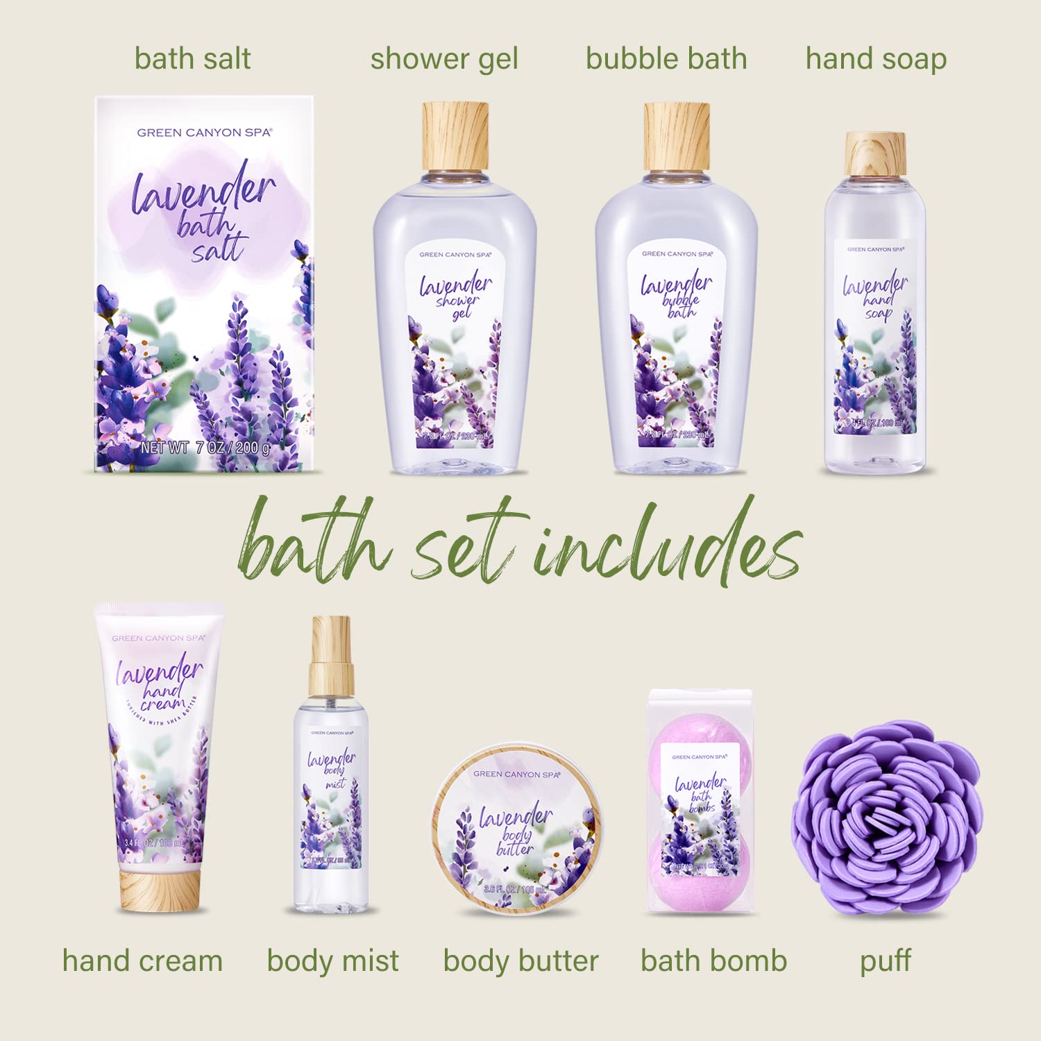 - The bath gift basket is infused with lavender flower and honey essence which makes you enjoy the gentle scent of lavender in your bath time, helps relax your body and provides the ultimate home spa pampering session