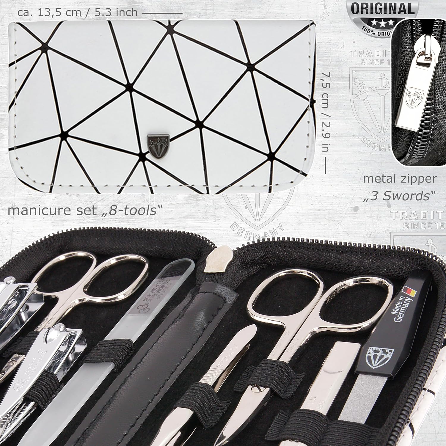- CASE: Synthetic leather white/black "SPIDER", size ca. 14,0 x 8,0 x 3,0 cm. Our organizers are made of high-grade fashion or classic materials. Additional equipment: Microfiber cleaning cloth for cleaning steel items, general info sheet “Finger - Nail Grooming”.