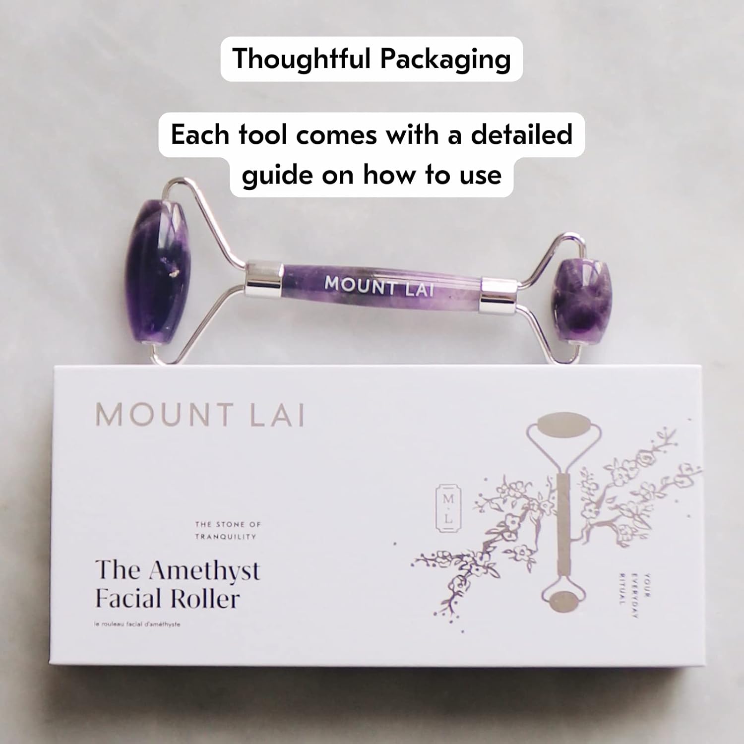 - Dual-ended design: Featuring two roller heads, one with a larger stone for the face and another with a smaller stone for the under-eye area, the Mount Lai Amethyst Massage Face Massager Roller is versatile and perfect for all areas of the face.