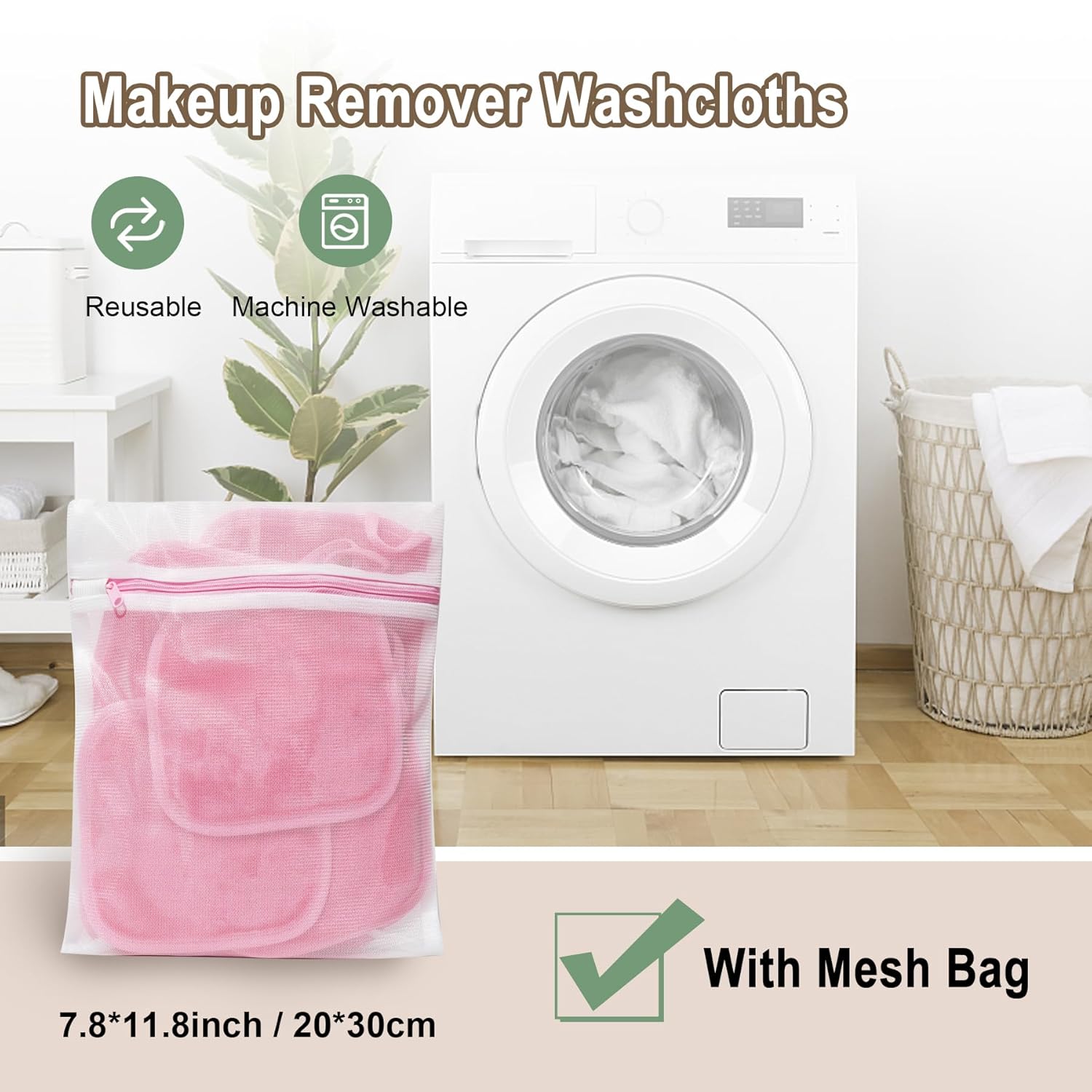 KODAMO Makeup Remover Cloth, Reusable Makeup Remover Pads Washable Travel Bag, Microfiber Makeup Removal Face Wash Cloths with Just Water, Gentle Soft,12 Pack, Pink