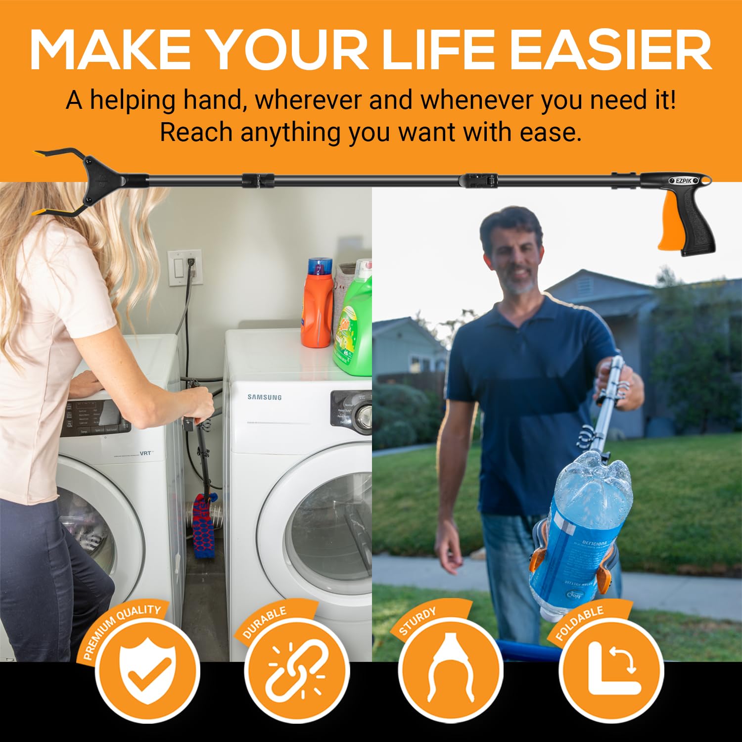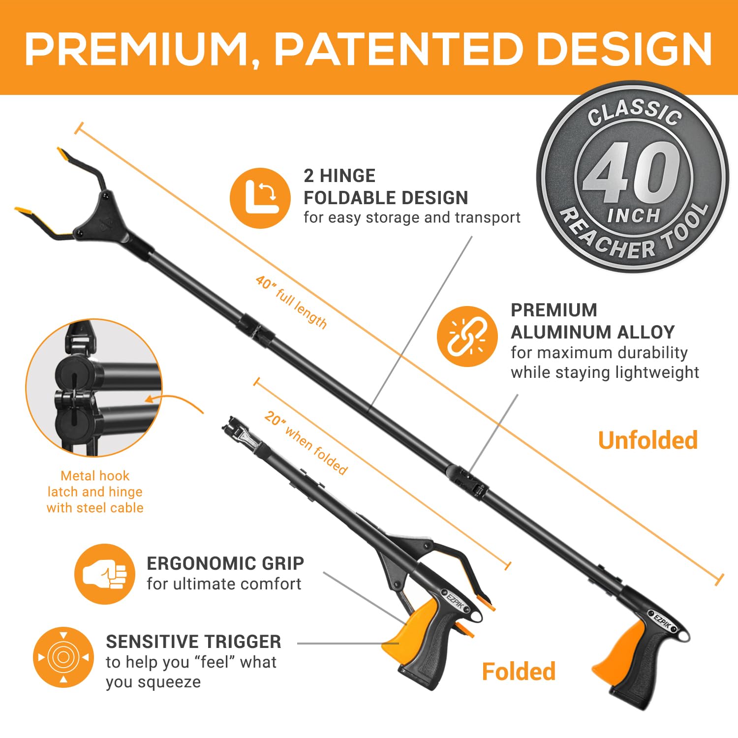 EZPIK Classic 40" Flexible Folding Grabber Tool for Elderly + Magnets, Reacher for Disabled & Seniors Heavy Duty Rotating Grippers for Reaching Underneath, Trash Grabbers & Pickers for Mobility 2-Pack