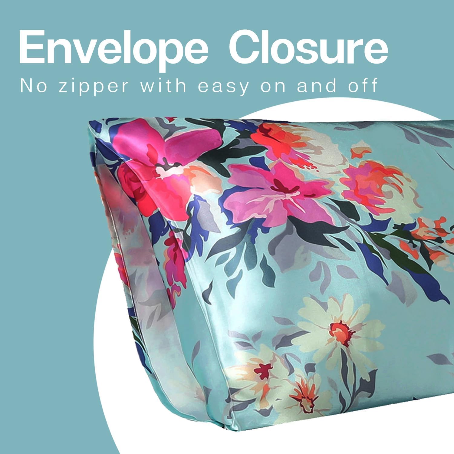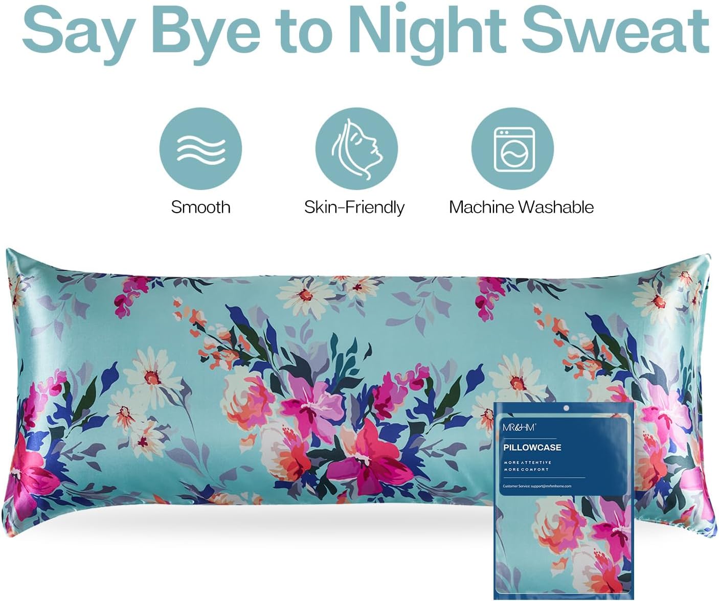 MR&HM Satin Body Pillow Cover, Soft and Breathable Body Pillow Case with Envelope Closure, Cooling and Silky Long Pillowcase for Hair and Skin,Grey (20x54, Floral Green)