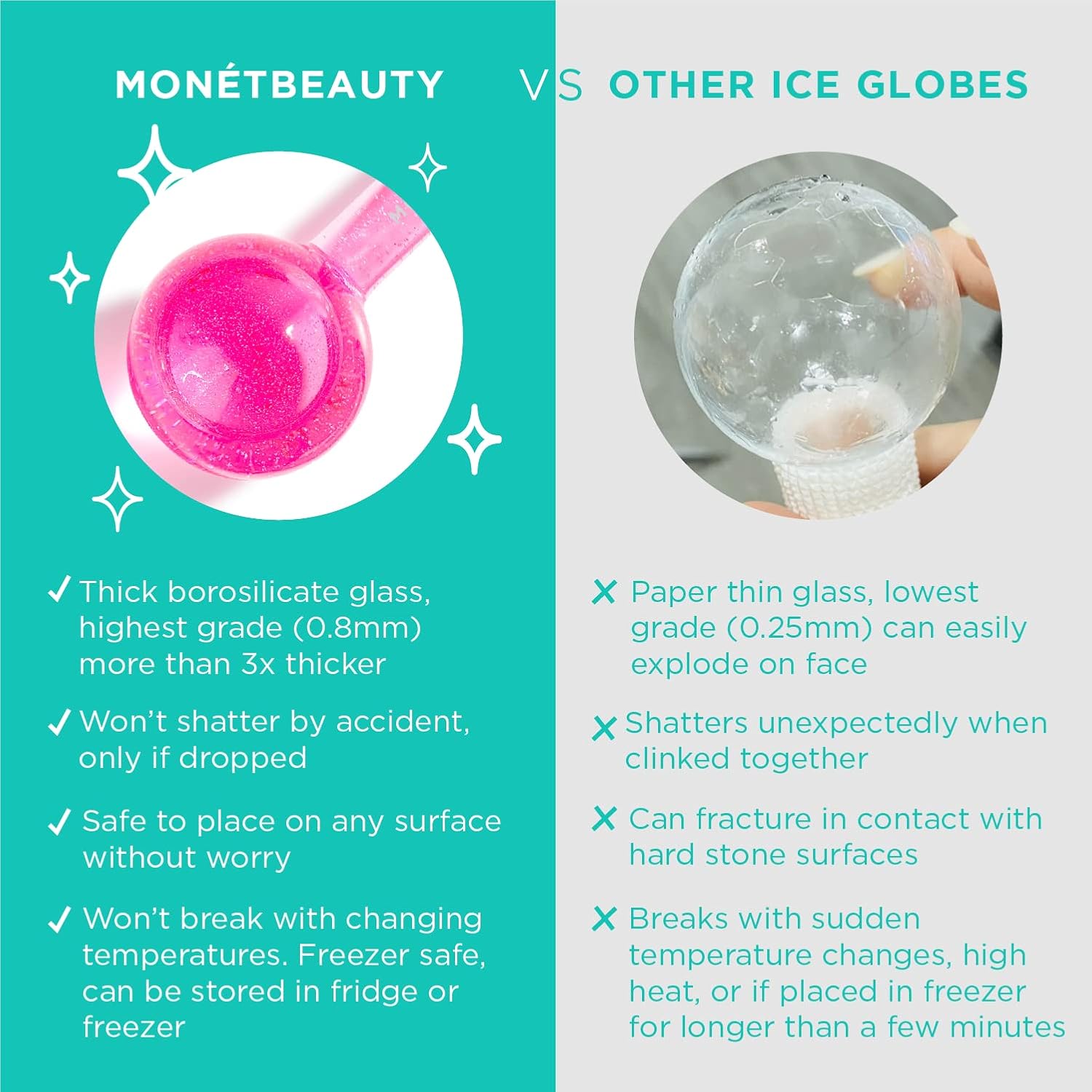 - Made with premium glass and non-toxic antifreeze liquid. Unlike other brands, MonetBeauty Ice Globes are safe to store in the freezer, we use only high-end durable borosilicate glass to minimize likelihood of glass breakage.