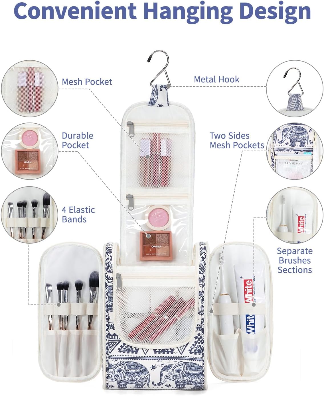 - DETAILS ORIENTED - Buit-in large metal hook allows hanging the toiletry case from towel rack, coat hook or whereever is available, making your toiletries and cosmetics displayed well for easy access, saving bathroom counter space as well. Water-resistent and durable fabric protects your gear from spills. Soft fabric and reliable zippers. Wide opening and rectangle shape makes it easy to stand on its own