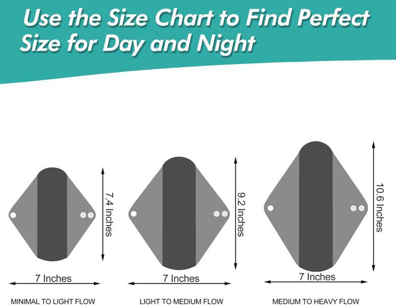 - 3 Size Available - Washable mentrual pads Small size 7.4inches Length X 7inches Width (including wings) ; Medium size 9.2 inches Length X 7.2 inches Width (including wings) ; Large size 10.6 inches Length X 7.2 inches Width (including wings).