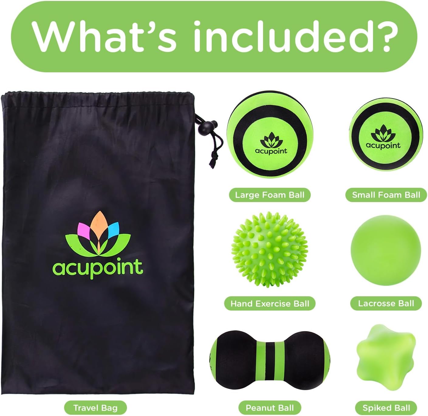 - COMPLETE MASSAGE BALL KIT: This set includes a trigger point peanut ball, a large foam ball, a spiked massage ball for feet, a lacrosse ball, a small foam ball, and a hand exercise ball. It comes with a convenient carry bag.