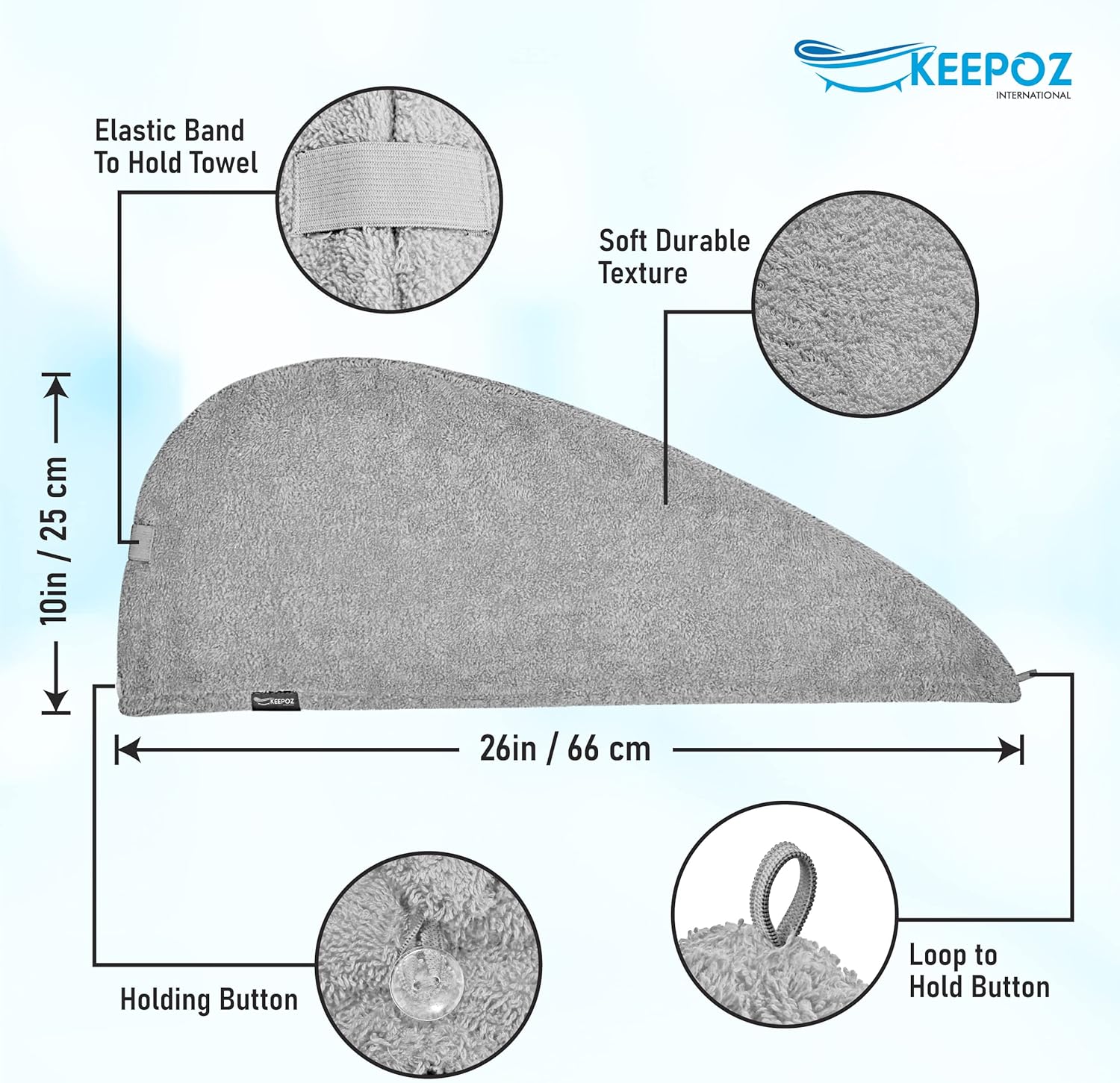 KEEPOZ Hair Towel Wrap Quick Dry 100% Cotton Super Absorbent Turban Head Wrap for Women with Button, Non Microfiber Anti Frizz Hair Products, Hair Cap for Curly, Long Hair (Grey, 1 Pc)