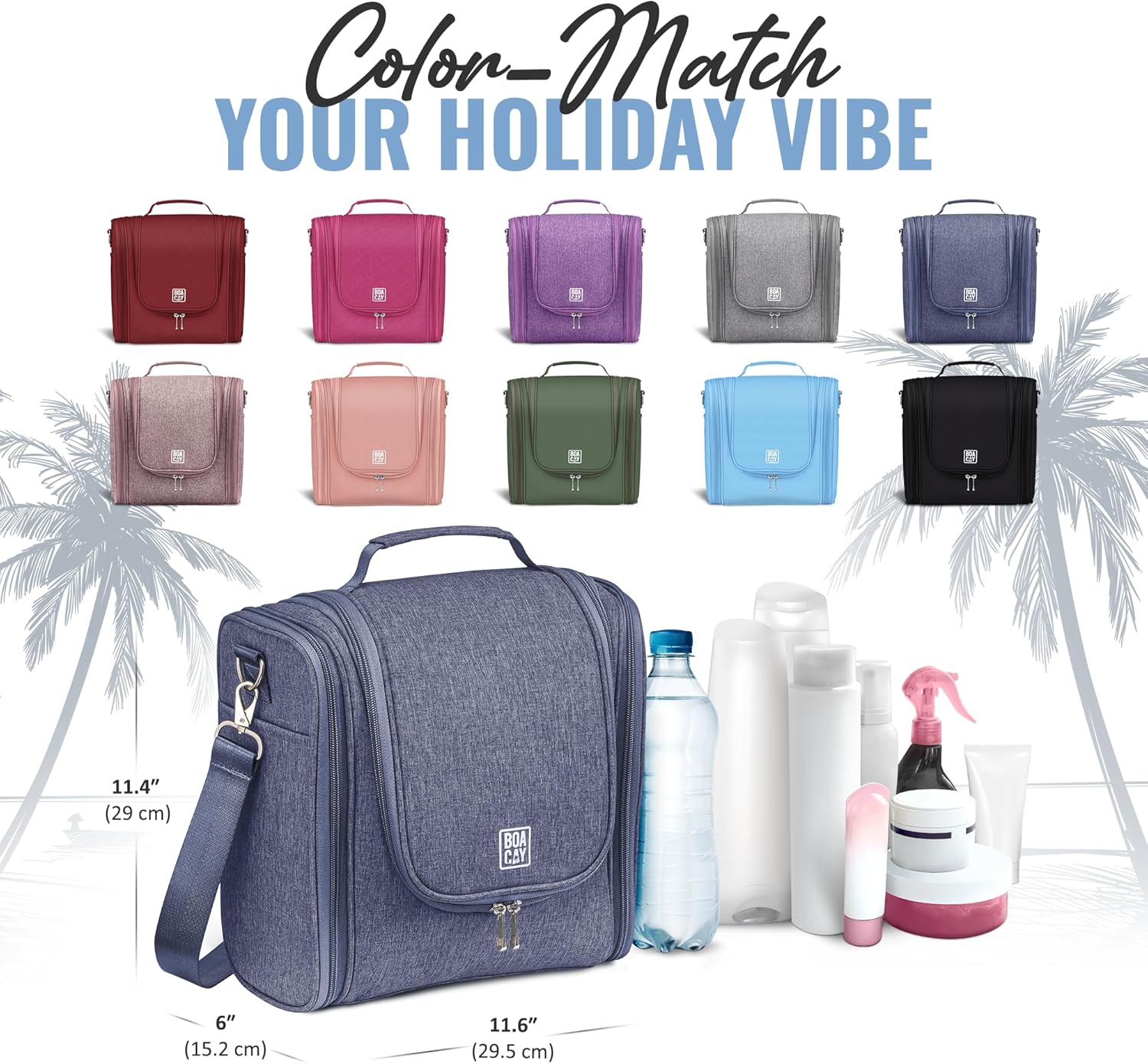 - If you want a large makeup bag, a cosmetic, or an accessories organizer, Boacay toiletry bag is for you. It is multifunctional, has metal zipper pulls, and itβs made of only high-quality materials.
