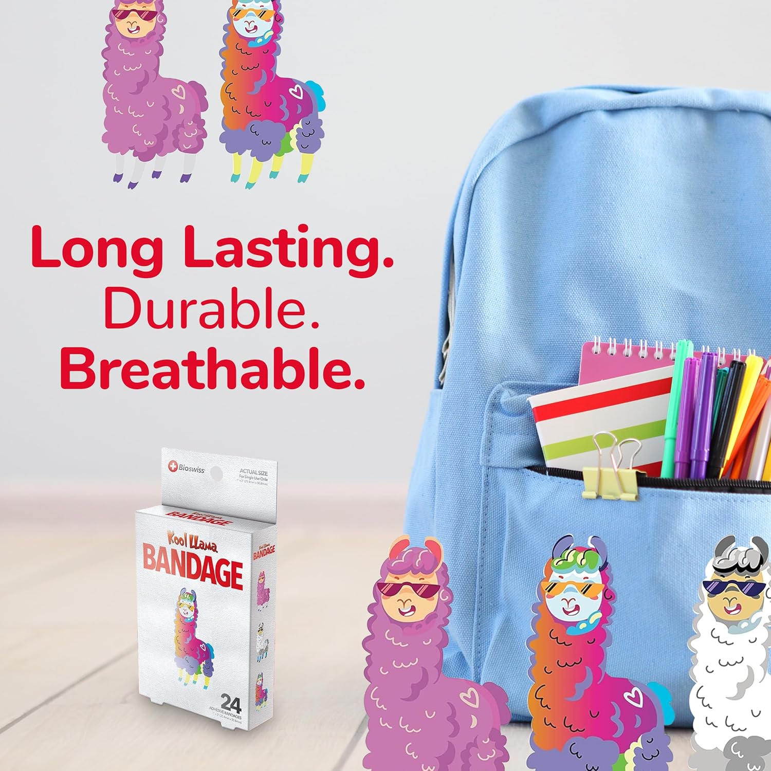 - 24 LLAMA KIDS BANDAGES: Fun llama-shaped adhesive bandages pack helps protect cuts, scrapes, and minor wounds while making healing less stressful for children