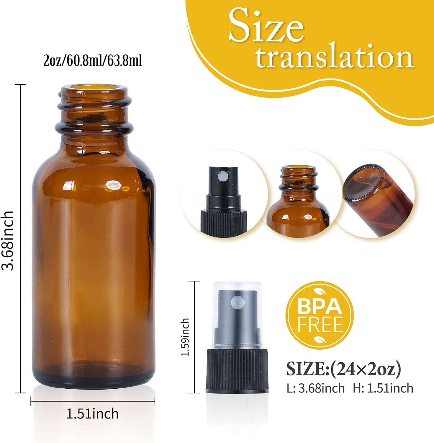 2oz Glass Spray Bottle, Fine Mist Boston Glass Bottles with Black Fine Mist Sprayer Small Clear Bottles for Essential Oils, Bath, Beauty, Hair & Cleaning, Amber, Pack of 24