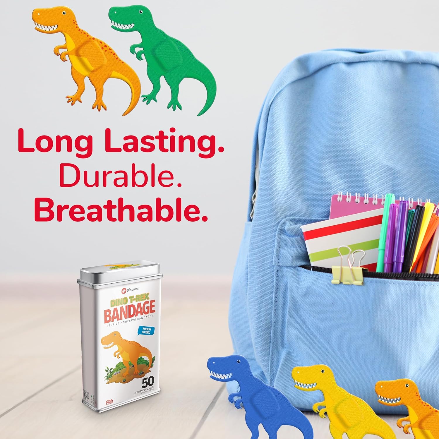 - 50 DINOSAUR KIDS BANDAGES: Fun dinosaur-shaped adhesive bandages tin helps protect cuts, scrapes, and minor wounds while making healing less stressful for children; bandages come in 4 assorted styles