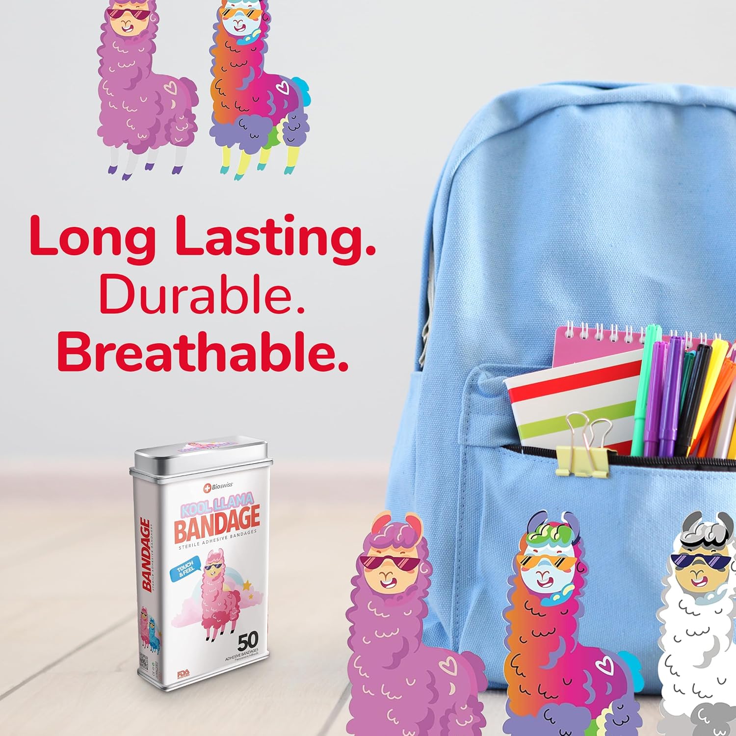- 50 LLAMA KIDS BANDAGES: Fun llama-shaped adhesive bandages tin helps protect cuts, scrapes, and minor wounds while making healing less stressful for children