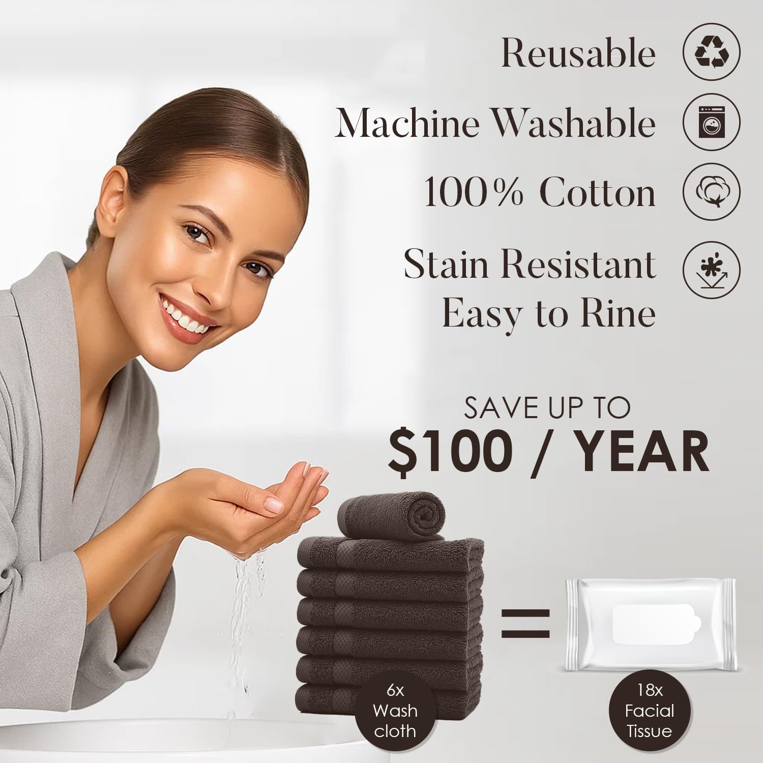 DAN RIVER 12-Pack Premium 100% Cotton Brown Face Towels – Reusable Face Towel Set, Soft & Absorbent Bath washcloths for Bathroom & Body – Hand and Face Towels, 550 GSM (12x12 in)