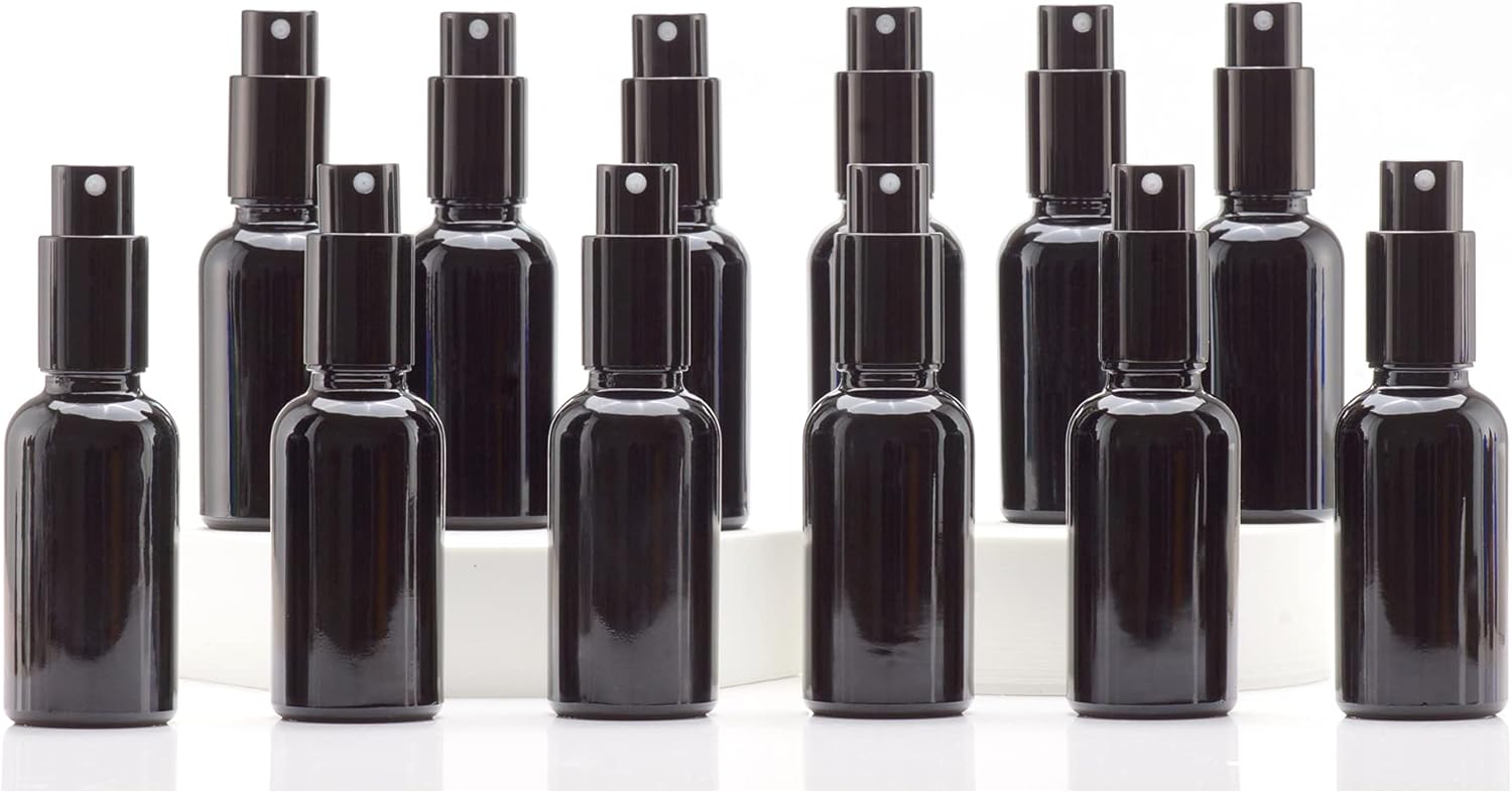 YIZHAO Black Glass Spray Bottles 1oz, with Small Fine Mist Spray, Metal Cap, Refillable for Essential Oil,Travel,Cleaning,Perfume,Aromatherapy,Makeup – 12 Pcs