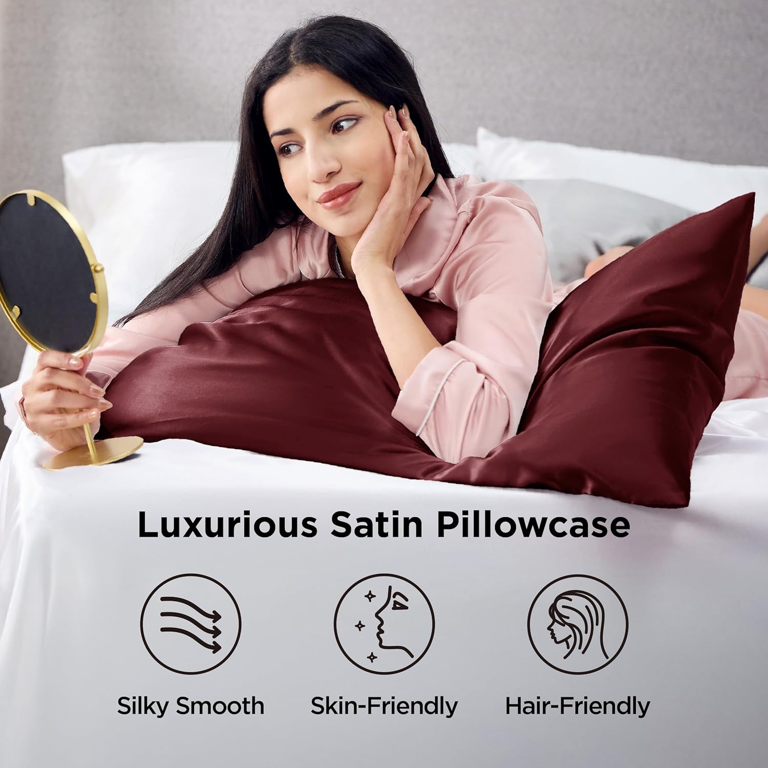 Bedsure Satin Pillowcases, Similar to Silk Pillow Cases Queen Size Set of 2, Burgundy Pillow Case with Envelope Closure, Christmas Decor Home Gifts for Women Men, 20x30 Inches, 2pcs