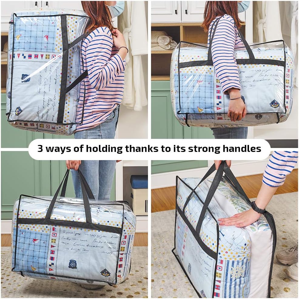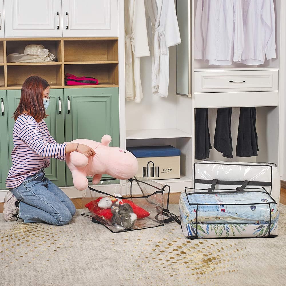 Clear Clothes Storage Bag Organizer with Reinforced Handle, Vinyl Storage Bags for Comforter, Blanket, Bedding, Toys, Transparent Moving Totes with Sturdy Dual Zippers, 3 Pack, 55 L, Black