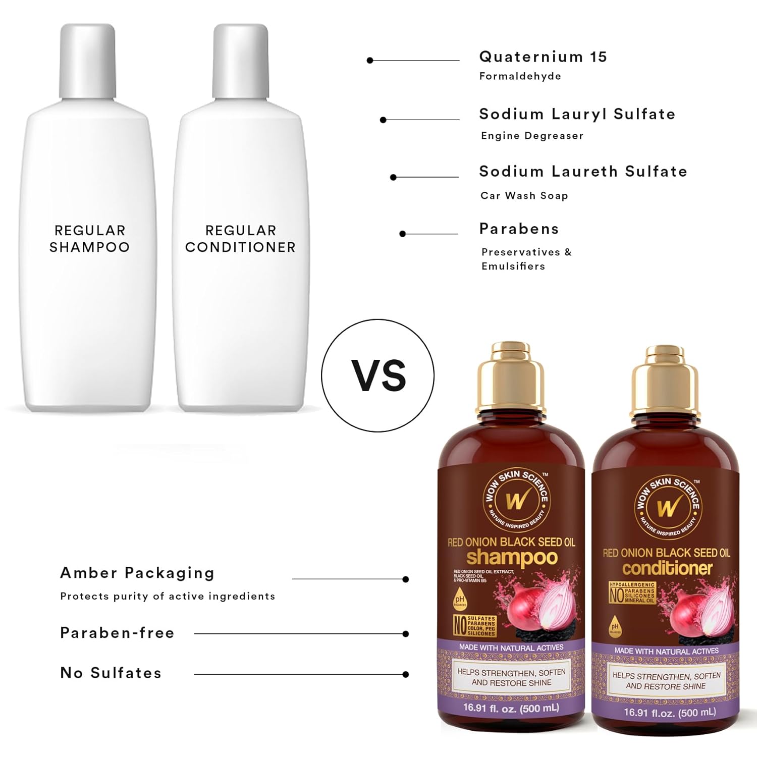 - Beautiful Strong Hair - Look & feel your best with onion hydrating shampoo & conditioner to work against breakage, split ends & thinning hair. WOW shampoo & conditioner set sulfate free formula helps give you the silkiest, softest & glossiest hair feeling