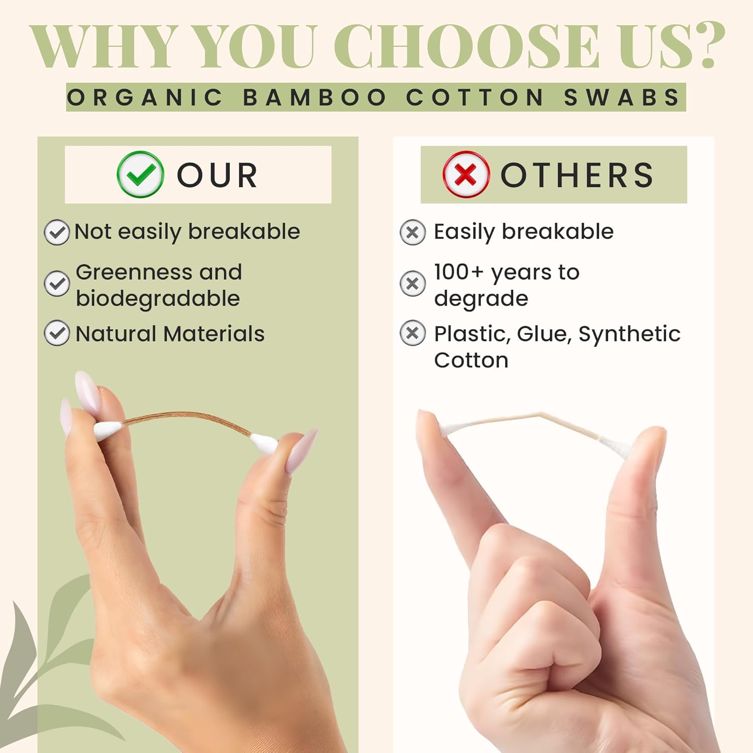 - 🥰YOU GET PREMIUM QUALITY and COMFORT with EVERY SWAB! Crafted in a sterile facility that also manufactures healthcare products, our cotton swabs are made from ultra-soft, high-quality cotton that feels gentle on your skin. They’re designed to be ultra-absorbent and densely packed, so they won’t shed, even when wet. The bamboo core is flexible yet sturdier than plastic or paper, ensuring they won’t bend or break during use. You get a hassle-free, comfortable experience every time!