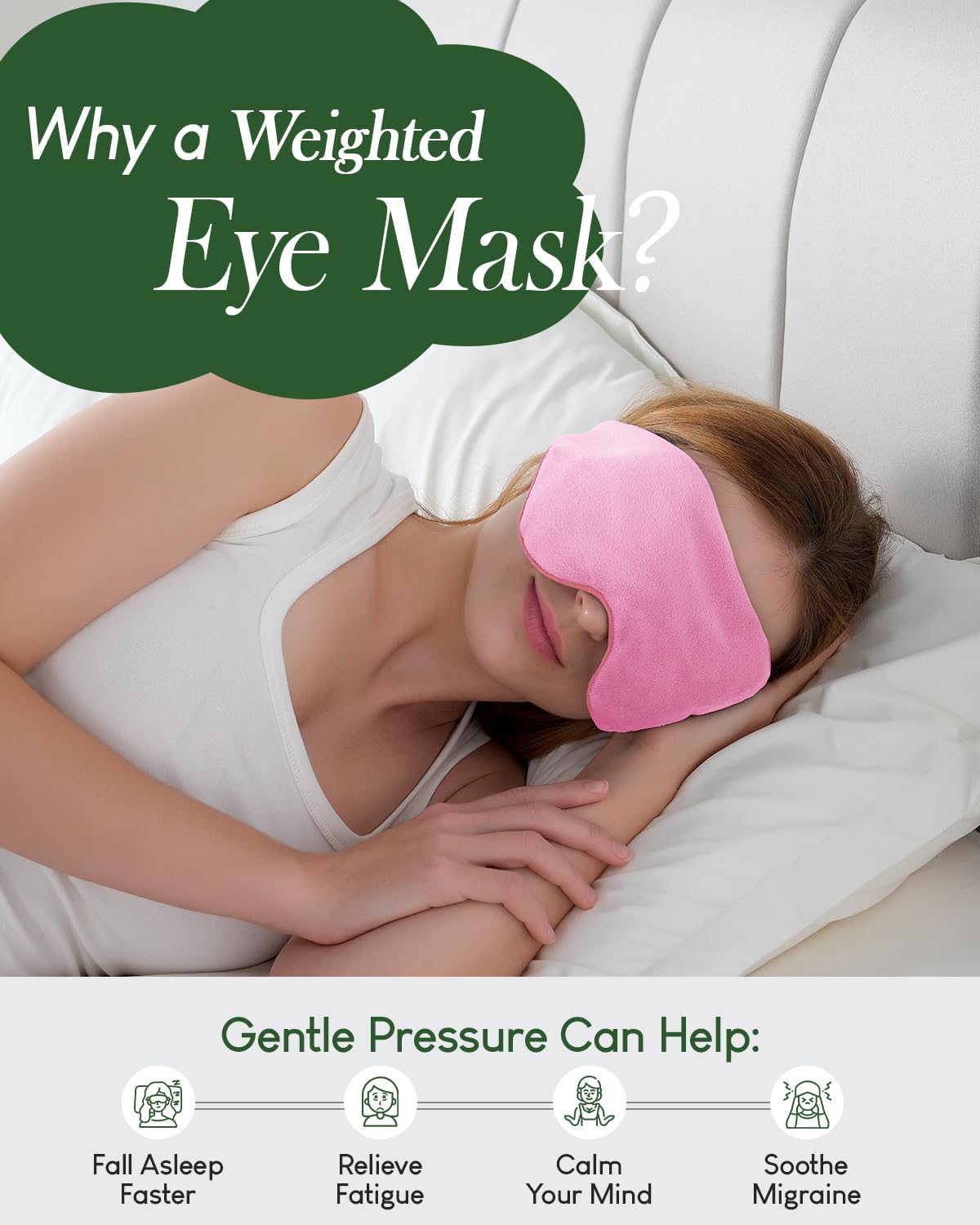 - Fall Asleep Faster: Our weighted eye mask, filled with glass microbeads, features a compartmental design that ensures balanced pressure, molding around your eyes. Great for helping you fall asleep, alleviating fatigue, calming the mind, or easing headaches.