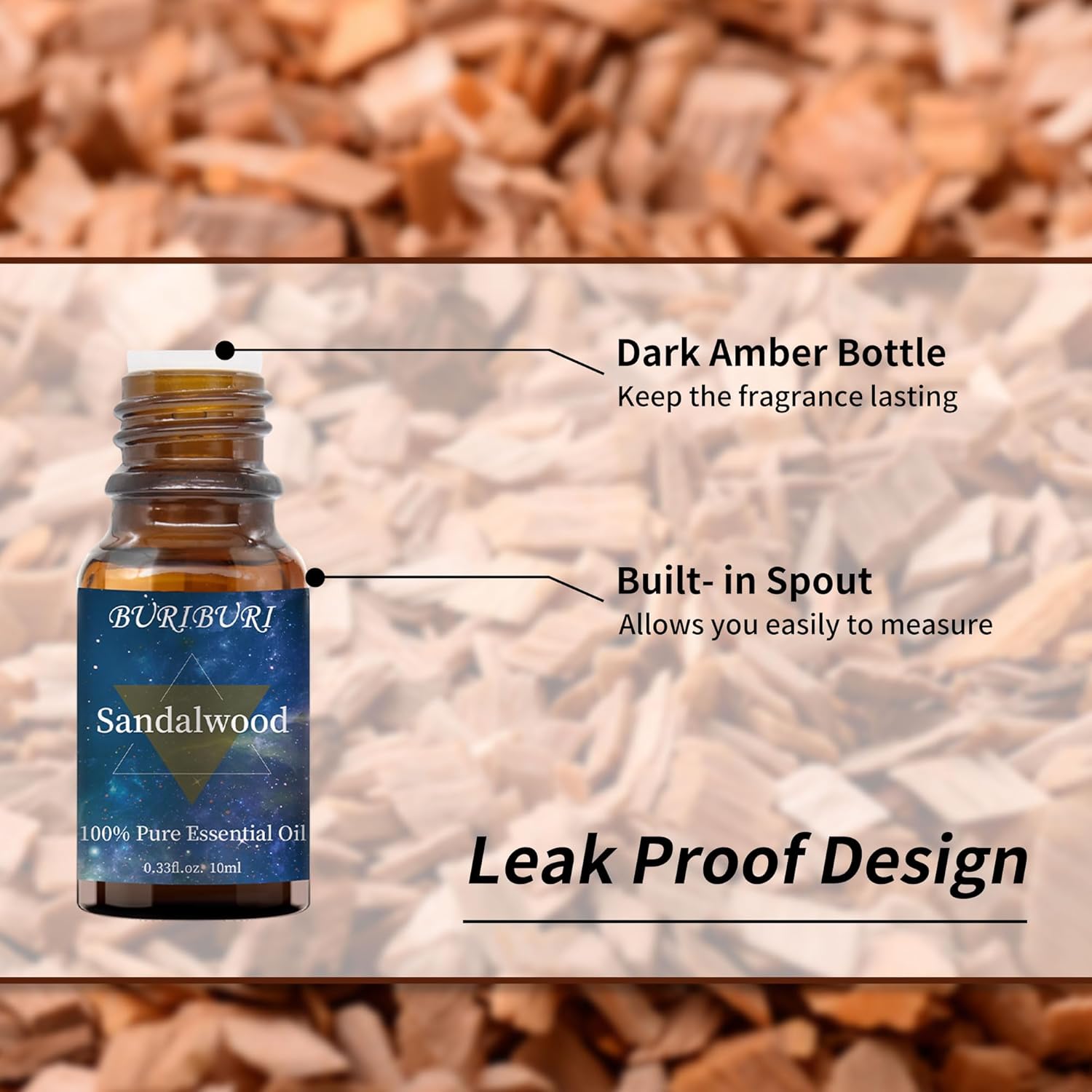 - Packing Includes: 10ml Sandalwood Essential Oil x2. With no adulterants or dilution, 100% pure quality. BURIBURI scented oil is bottled in a durable amber glass bottle.