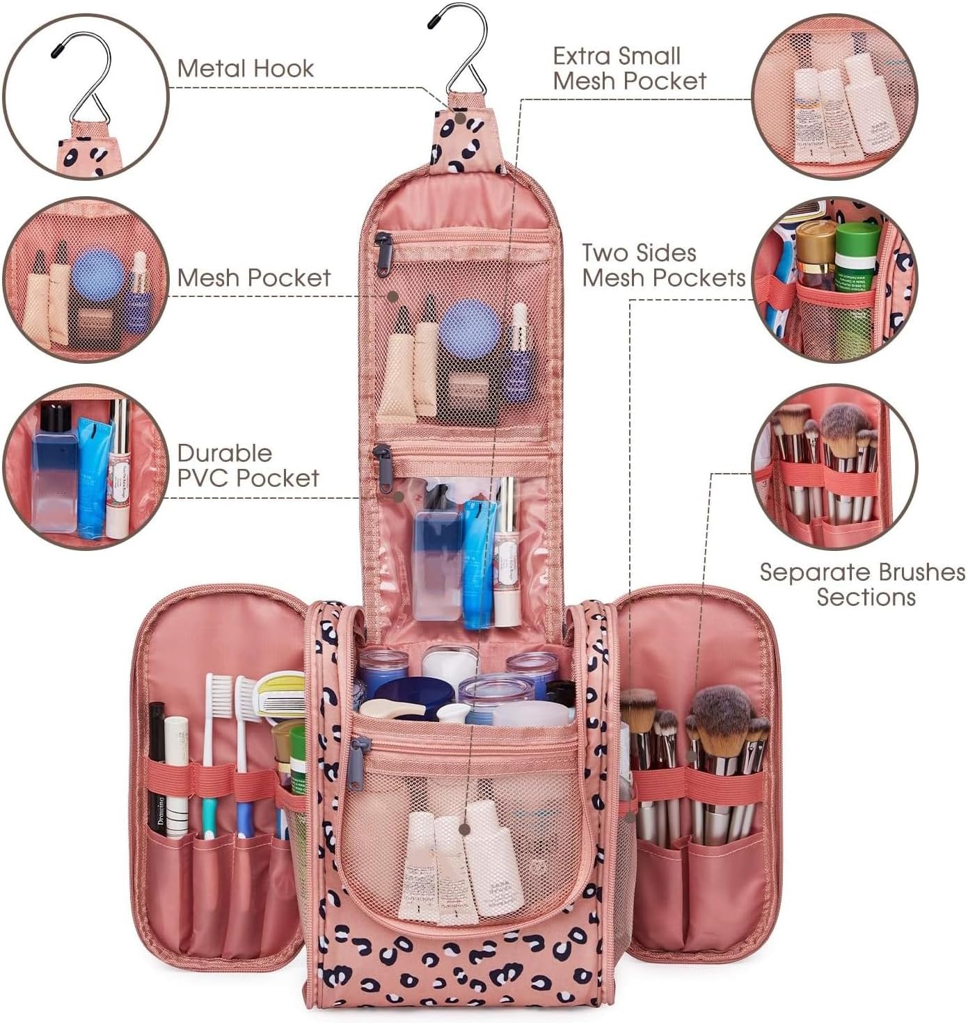 - DETAILS ORIENTED - Buit-in large metal hook allows hanging the toiletry case from towel rack, coat hook or whereever is available, making your toiletries and cosmetics displayed well for easy access, saving bathroom counter space as well. Water-resistent and durable fabric protects your gear from spills. Soft fabric and reliable zippers. Wide opening and rectangle shape makes it easy to stand on its own