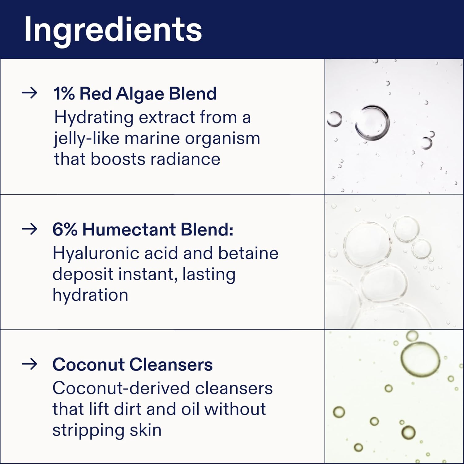 - INGREDIENTS - 1% Red Algae Blend is a hydrating extract that boosts radiance. 6% Humectant Blend with hyaluronic acid deposits instant, lasting hydration. Coconut-derived cleansers lift dirt and oil without stripping skin.