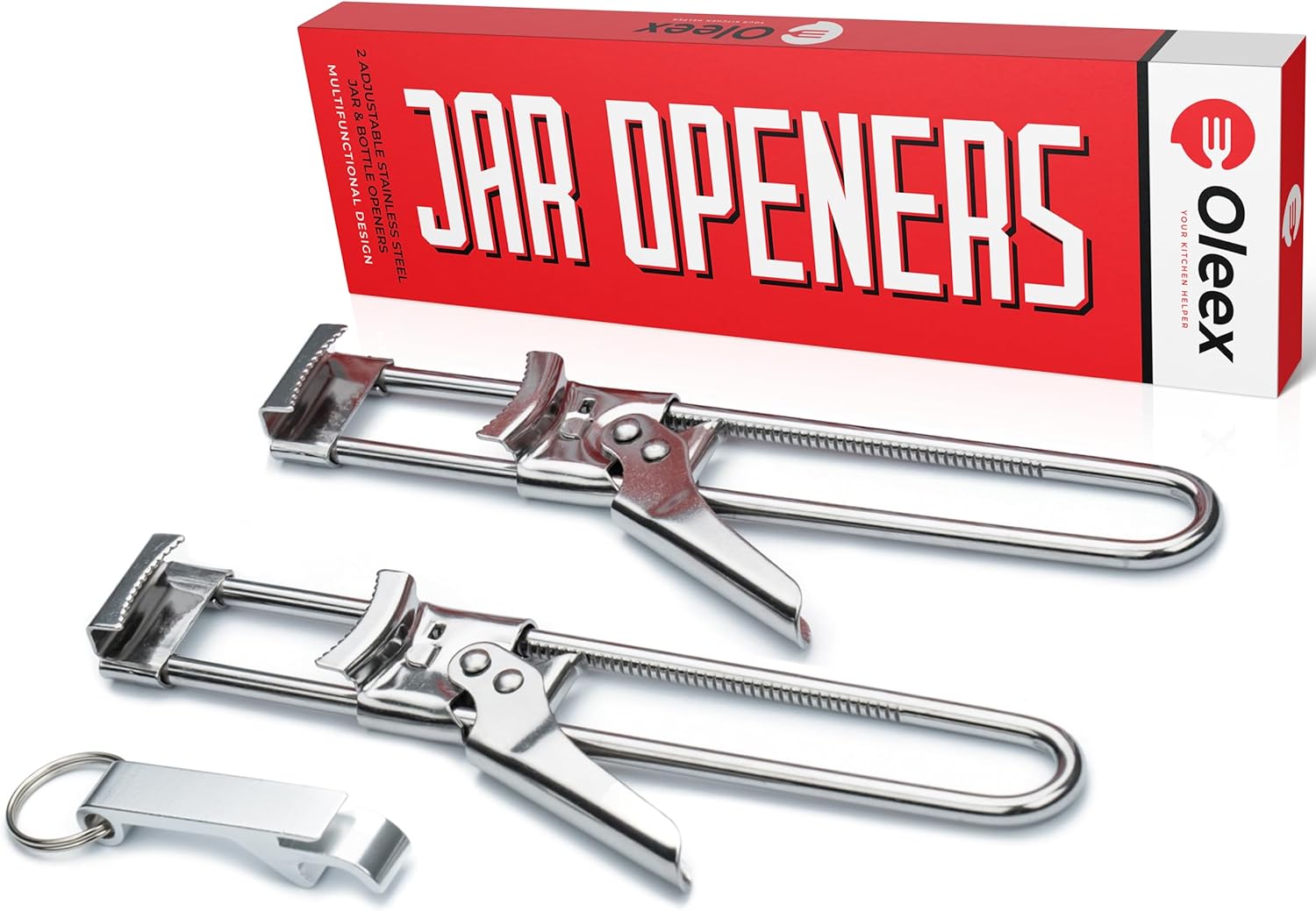 - ✅ Adjustable And Multifunctional: Oleex stainless steel grippers are for opening large or small jars, water or soda bottles, Mason Jars, and more! Simply open the wing and slide the teeth to grip your sized lid. Lock the wing and twist! The extra-deep teeth lock even more securely than other openers!