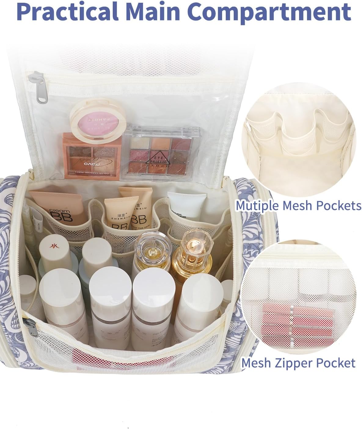 Narwey Hanging Toiletry Bag for Women Travel Makeup Bag Organizer Toiletries Bag Men for Cosmetics Essentials Accessories(Large, Blue Leaf)