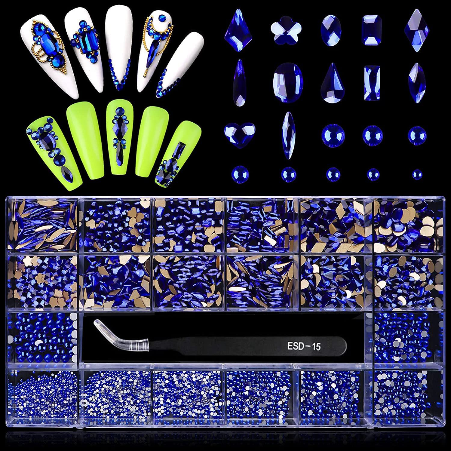- Amazing Luxury Crystal Set:Includes 20 types AB blue nail crystals, 12 kinds of big size ab rhinestone in all 600pcs, 8 sizes round rhinestones in all 2500pcs. The set also includes a dual-ended rhinestone picker dotting pen and a tweezers.