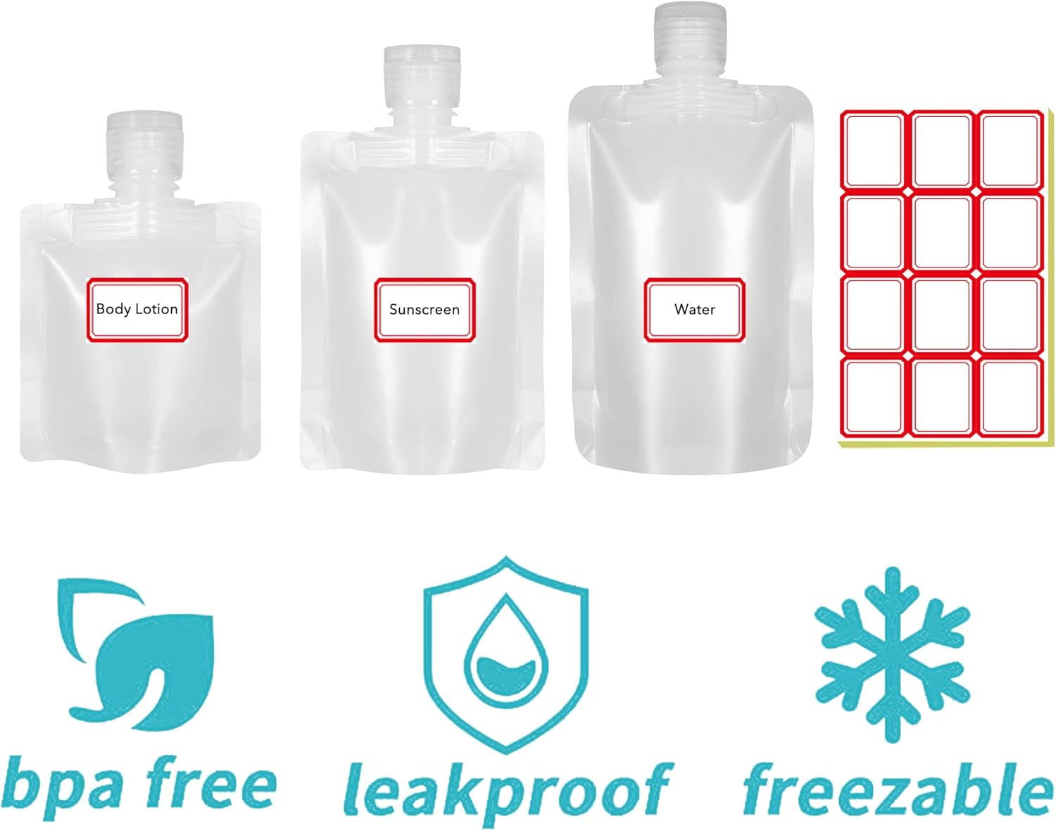 - SIZE & PACKAGE --- The package includes 18 pieces liquid cosmetic storage bags, enough to meet your needs. There are 3 different sizes for your choice: 30ml, 50ml, 100ml. We also provide you with 3 sheets of label paper and 3 foldable silicone funnels.
