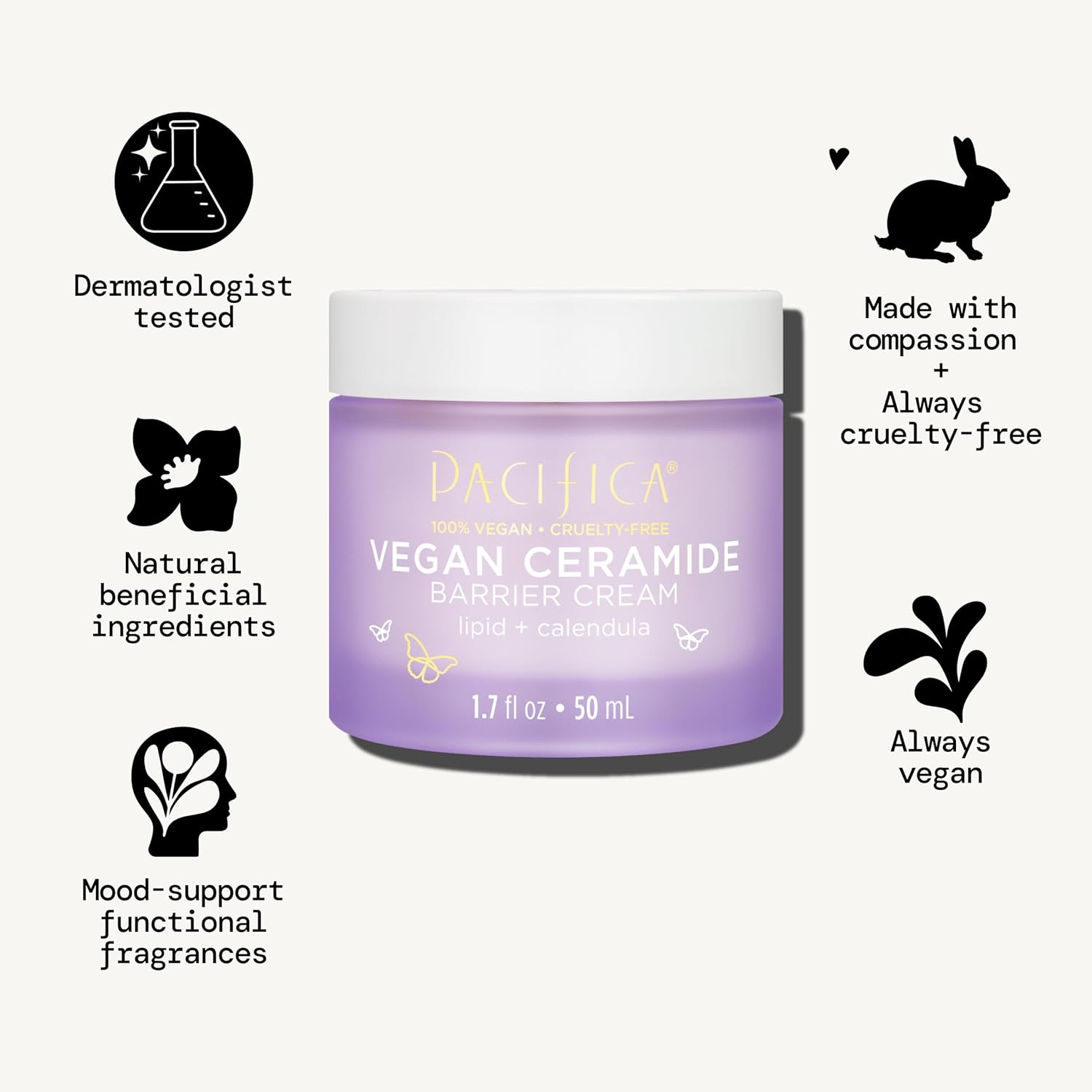- FREE OF HARSH CHEMICALS VEGAN, CRUELTY-FREE SKINCARE – Pacifica’s Vegan Ceramide Barrier Cream aligns with your clean beauty values. It’s 100% vegan and cruelty-free, using no animal-derived ceramides or testing. We leave out harsh chemicals and utilize nature-backed actives to deliver results you can see and feel. Love your skin back to health with an ethical daily moisturizer that nurtures your complexion while respecting the planet.