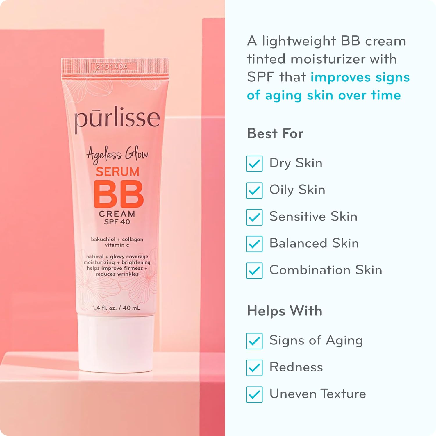 pūrlisse Ageless Glow Serum BB Cream SPF 40 - Glow BB Cream with SPF Enriched with Bakuchiol & Vitamin C to Help Improve Firmness & Reduce Wrinkles for Dewy Skin - Medium (1.4 oz)