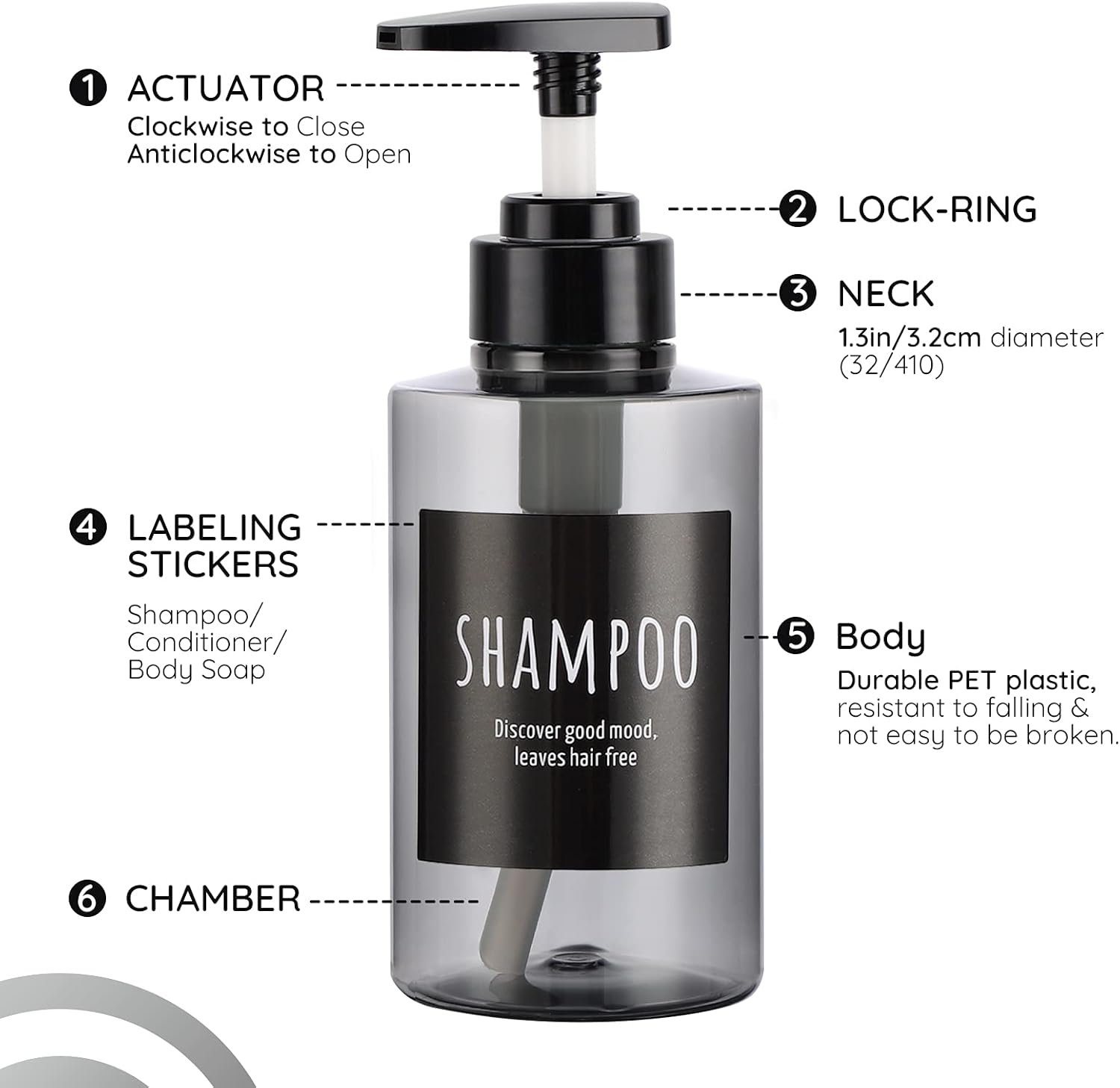 - 【10.1oz Capacity Set】Each dispenser bottle holds 300ml reasonable capacity to meet the whole family daily essential needs. Set of 3 packs of pre-labeled waterproof label bottles, indicating shampoo, body soap, and conditioner, can help you identify them easily.