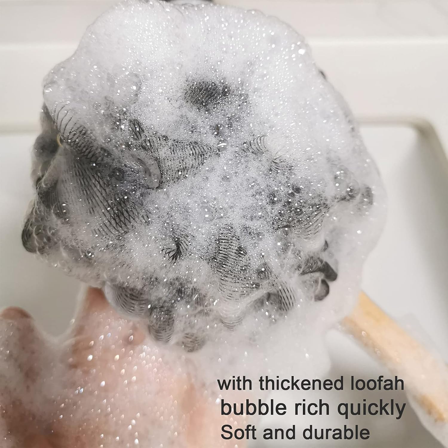Shower Sponge Loofah Back Scrubber, Soft Mesh Body Scrubber with Wooden Handle, Bath Sponge for Women Kids (Black)
