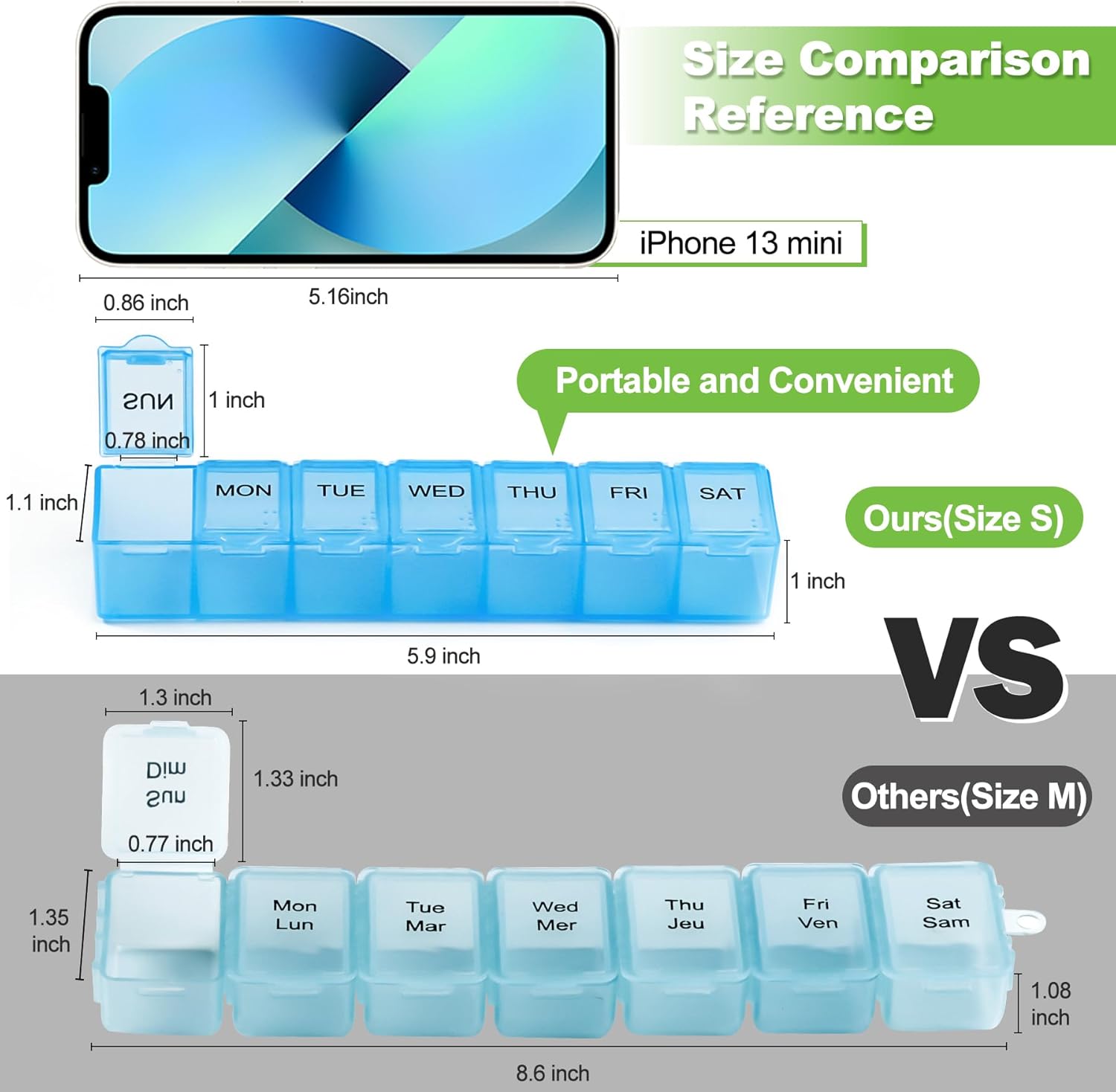 - 【 Small Size & High Capacity 】 7-day pill organizers are quite nice for easy daily dispensing and enough space for filling and sorting all your pills for the entire week. Small and portable size, perfect for your travel or on-the-go. (The size of each compartment measures approx. 1.1" x0.86" x1")